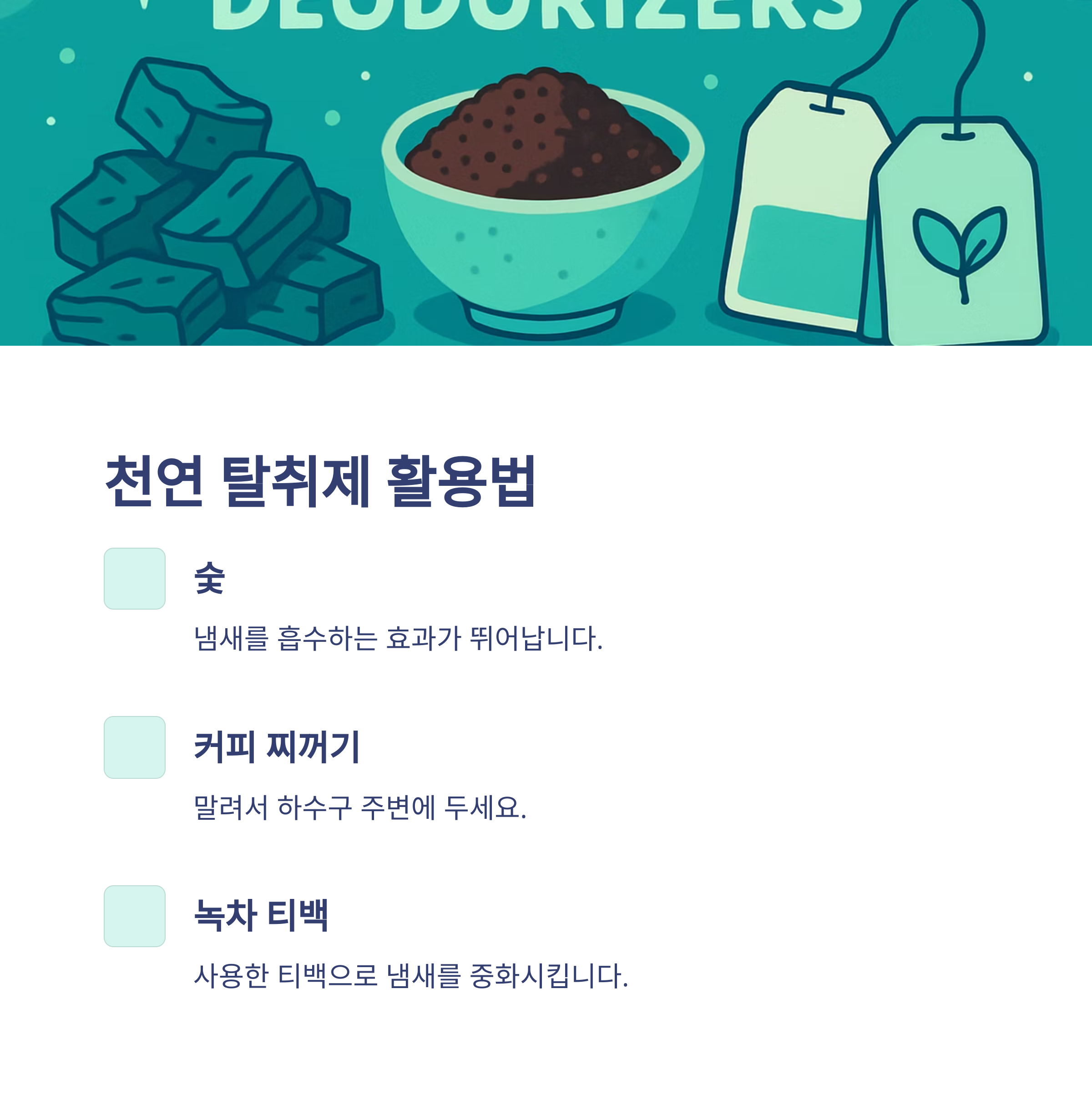 - 천연 탈취제: 숯, 커피 찌꺼기, 녹차 티백 등 활용
