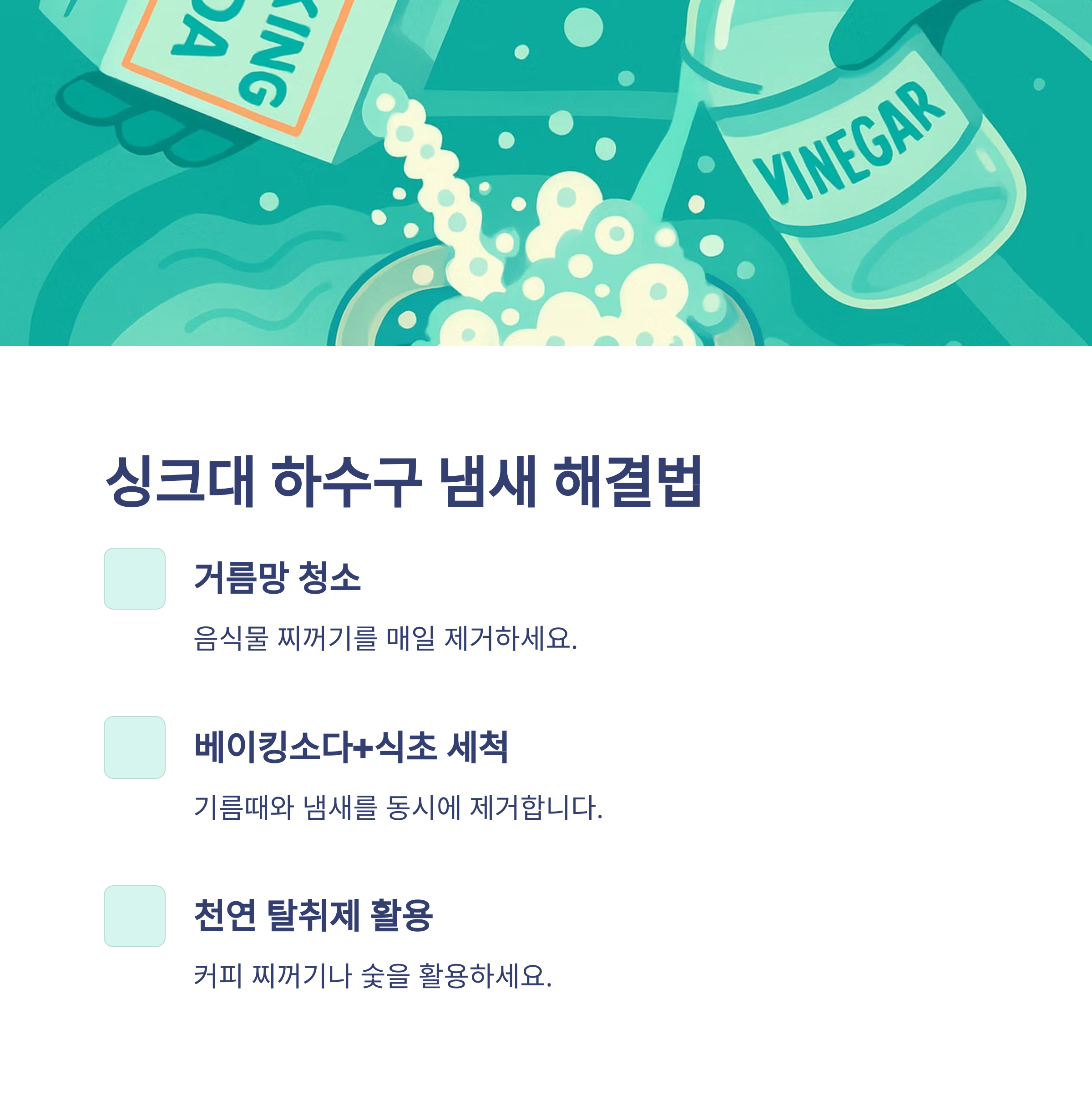 - 끓는 물 + 과탄산소다 + 식초 조합으로 배관 청소