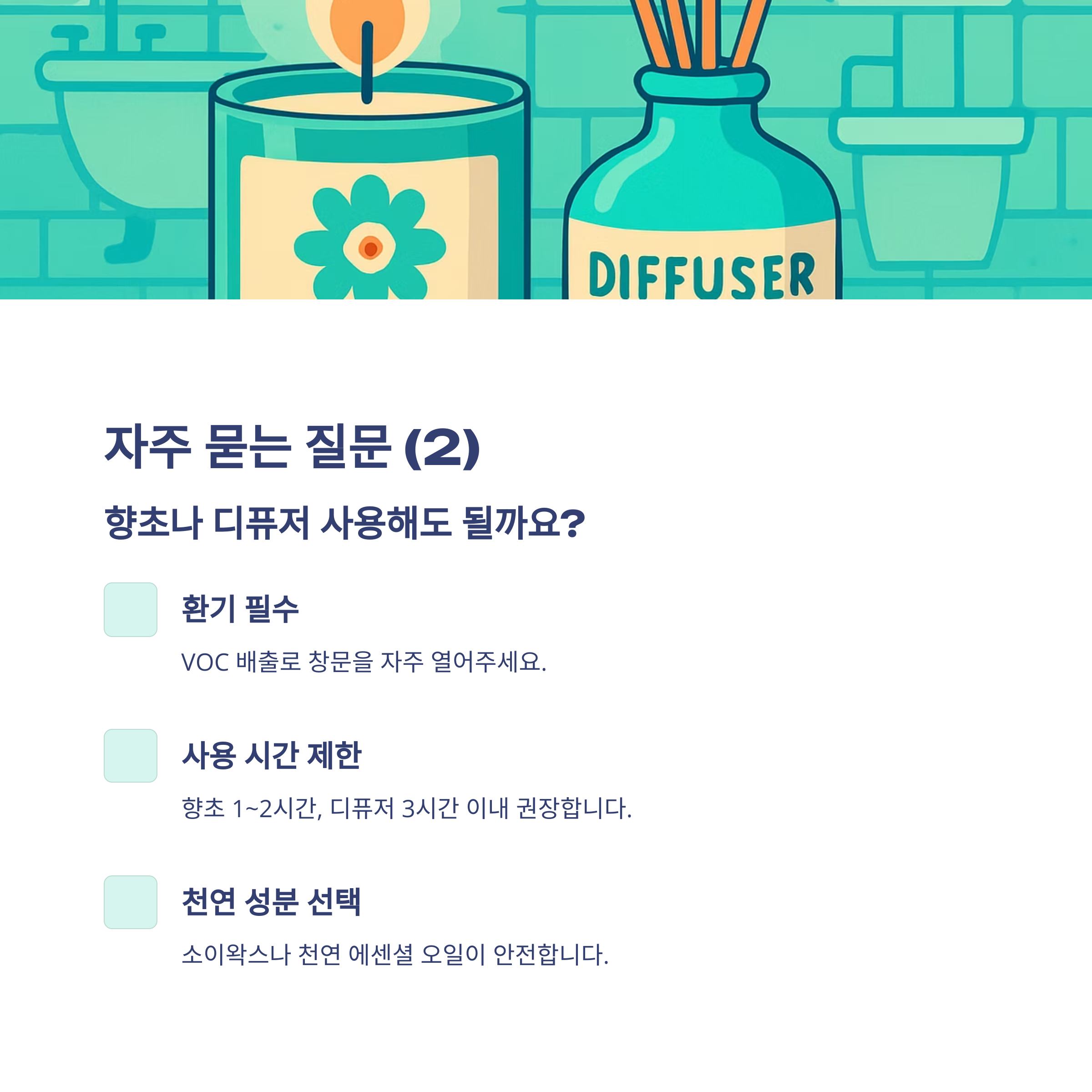 - 사용 시간 제한: 향초는 1~2시간, 디퓨저는 하루 3시간 이내 사용을 권장합니다.