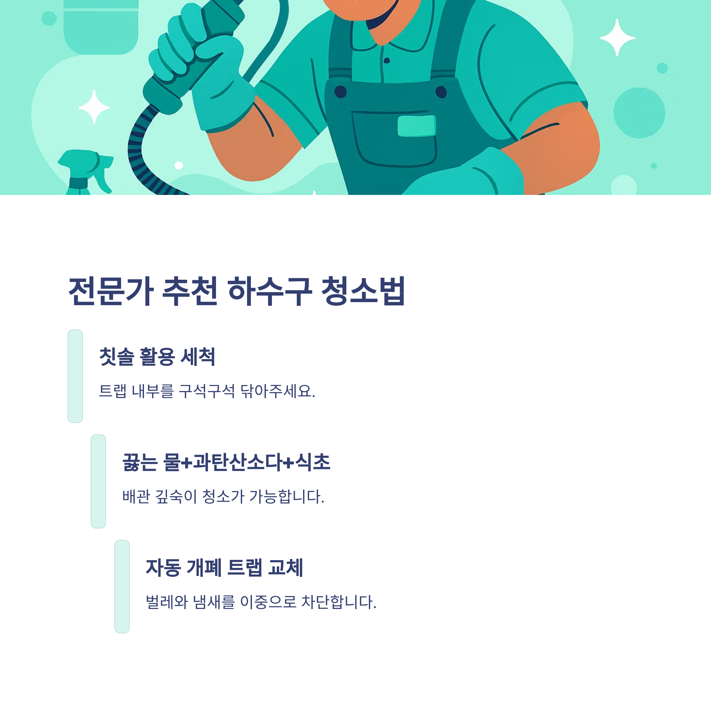 - 정기 청소: 트랩 및 배수구는 1~2주 간격 청소 권장