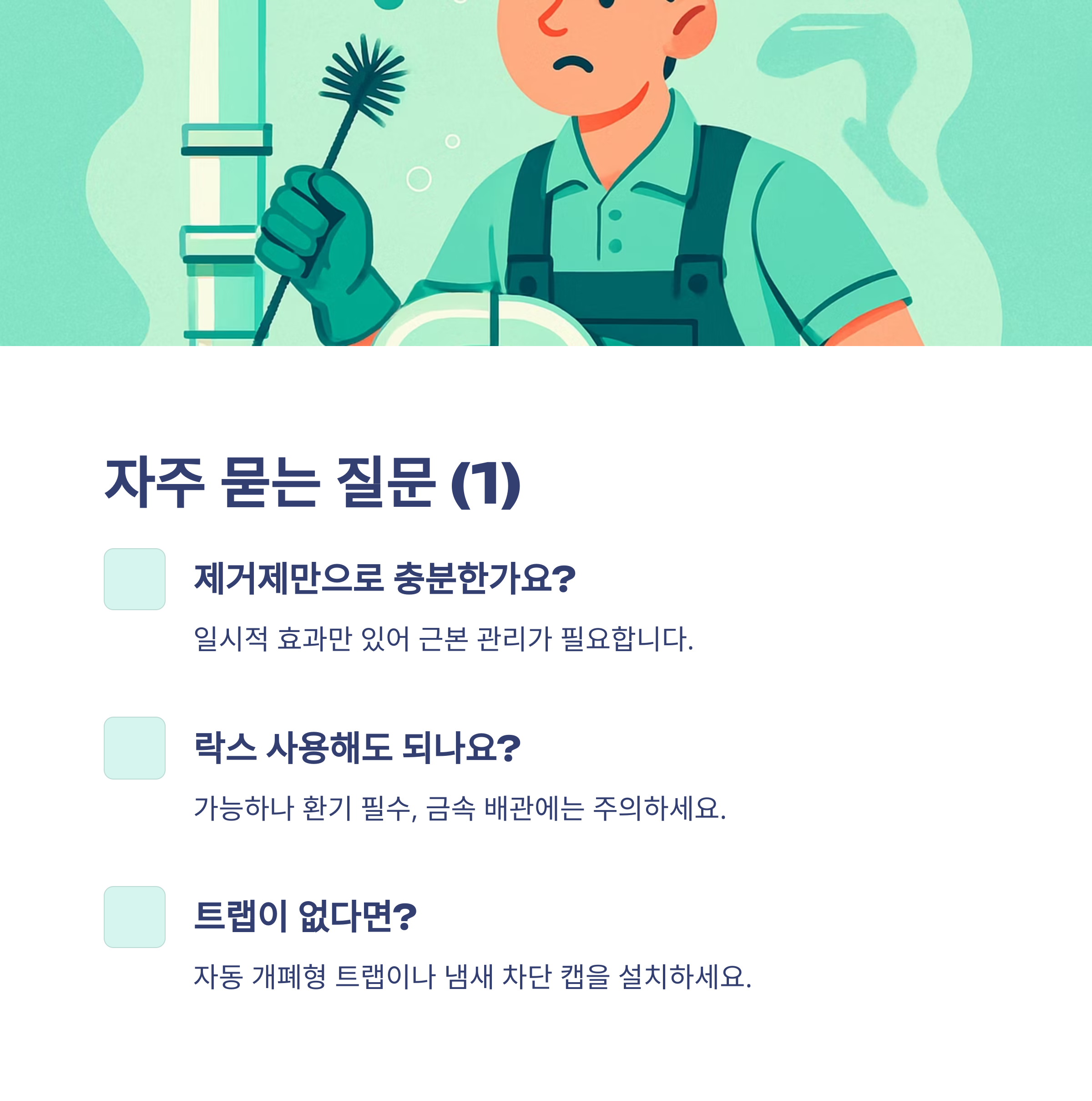 A1. 일시적으로 효과는 있지만, 트랩 물 유지·이물질 제거 등 근본 관리가 병행돼야 지속적인 효과를 볼 수 있습니다.