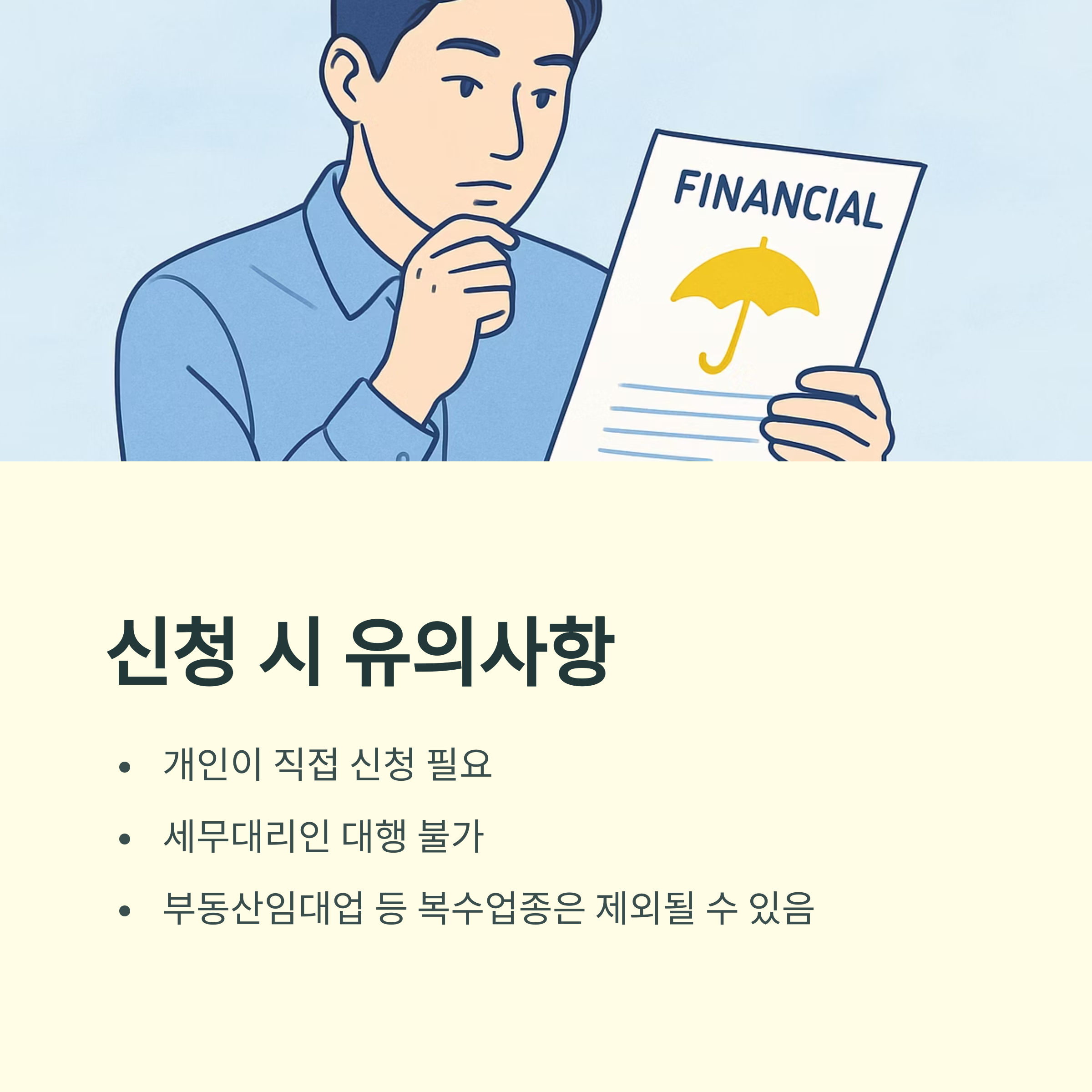 - 신청 자격: 개인이 직접 신청해야 하며, 세무대리인 대행 불가