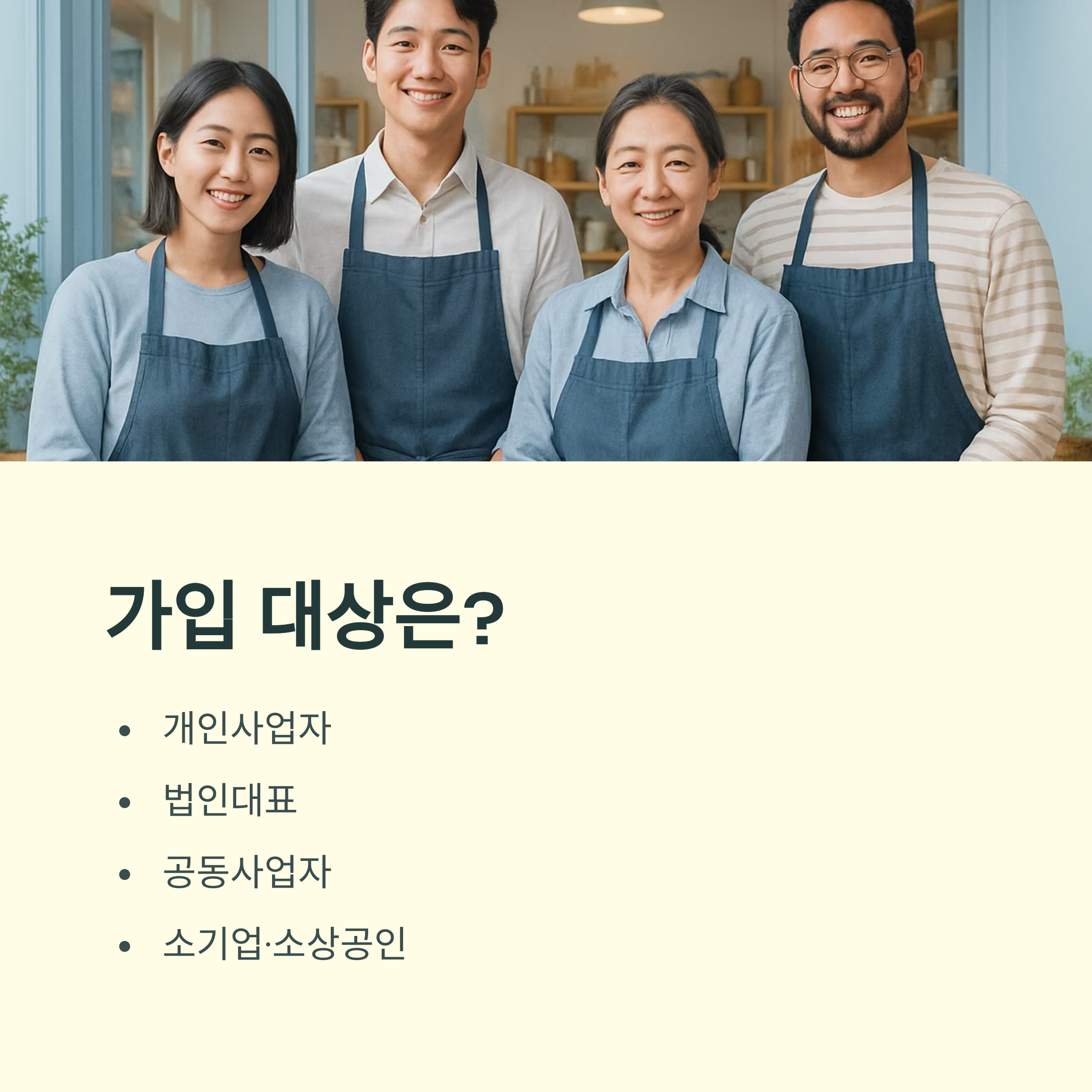 - 가입 대상: 개인사업자, 법인대표, 공동사업자 등 소기업·소상공인