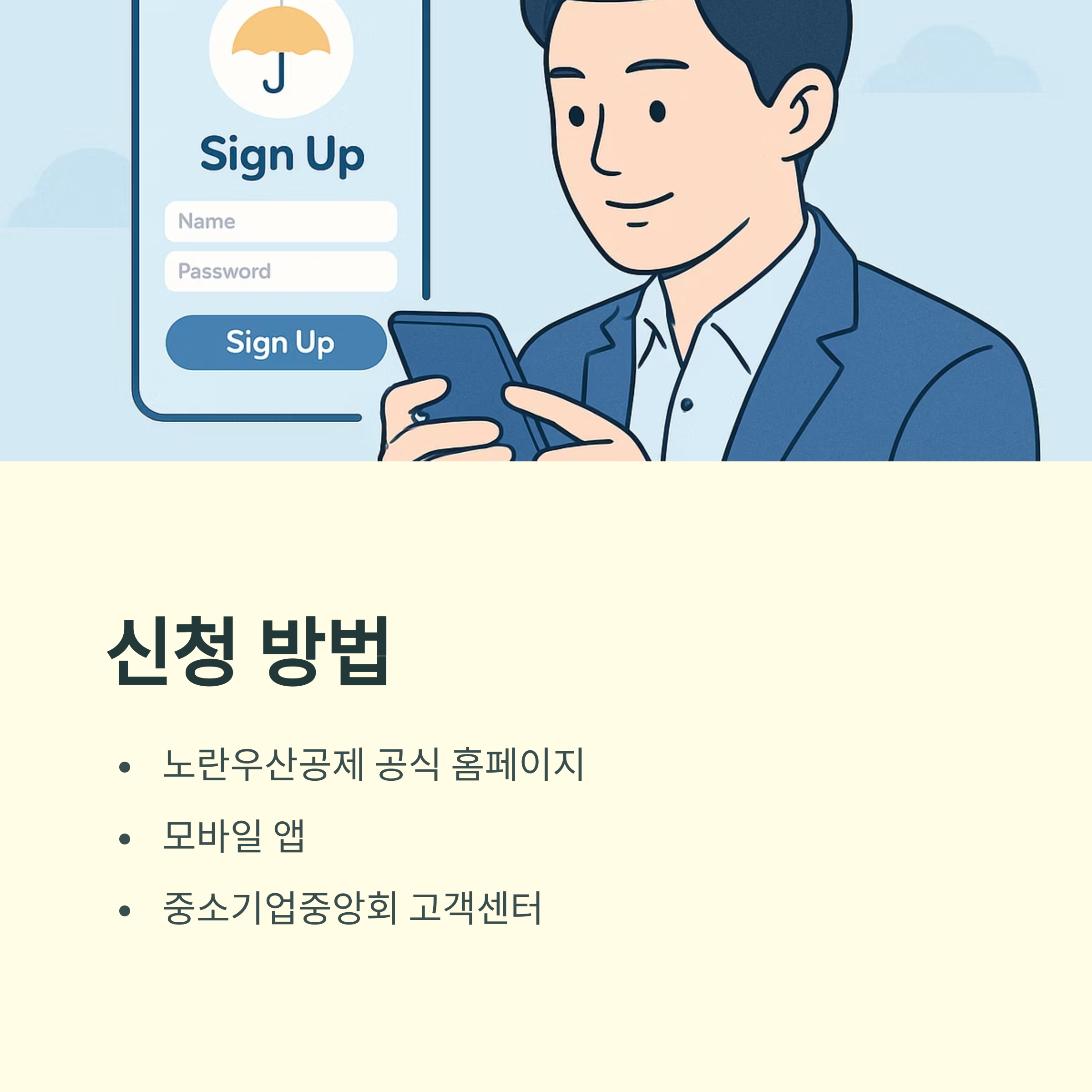 - 신청 경로: 노란우산공제 공식 홈페이지, 모바일 앱, 중소기업중앙회 고객센터
