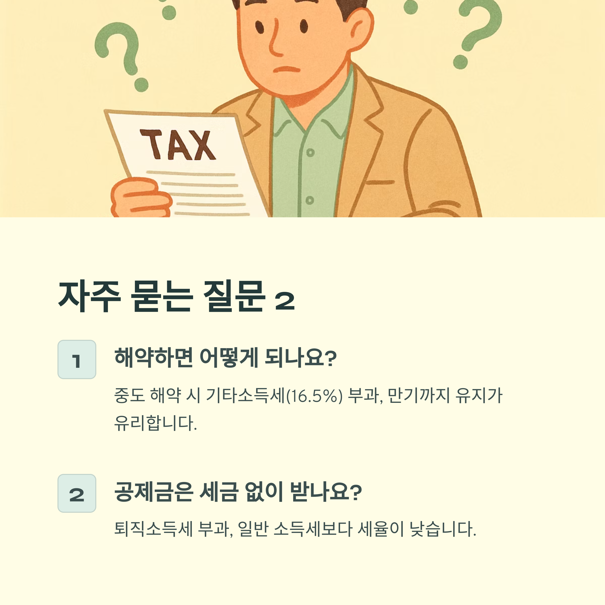 A. 중도 해약 시 기존 소득공제 혜택에 대해 기타소득세가 부과되니, 가능하면 만기까지 유지하세요.