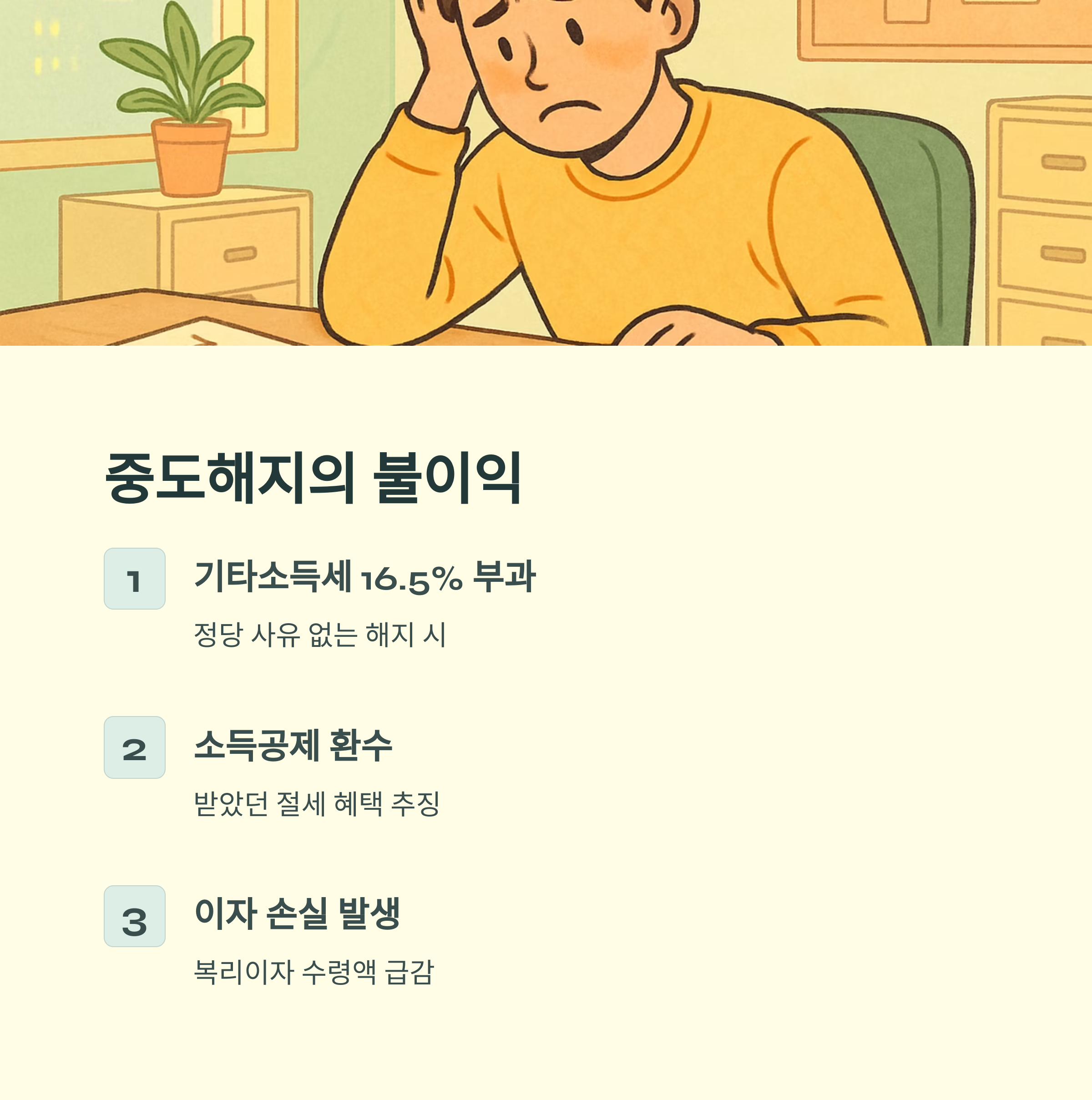 - 소득공제 환수: 가입 중 받은 절세 혜택 일부를 다시 세금으로 추징
