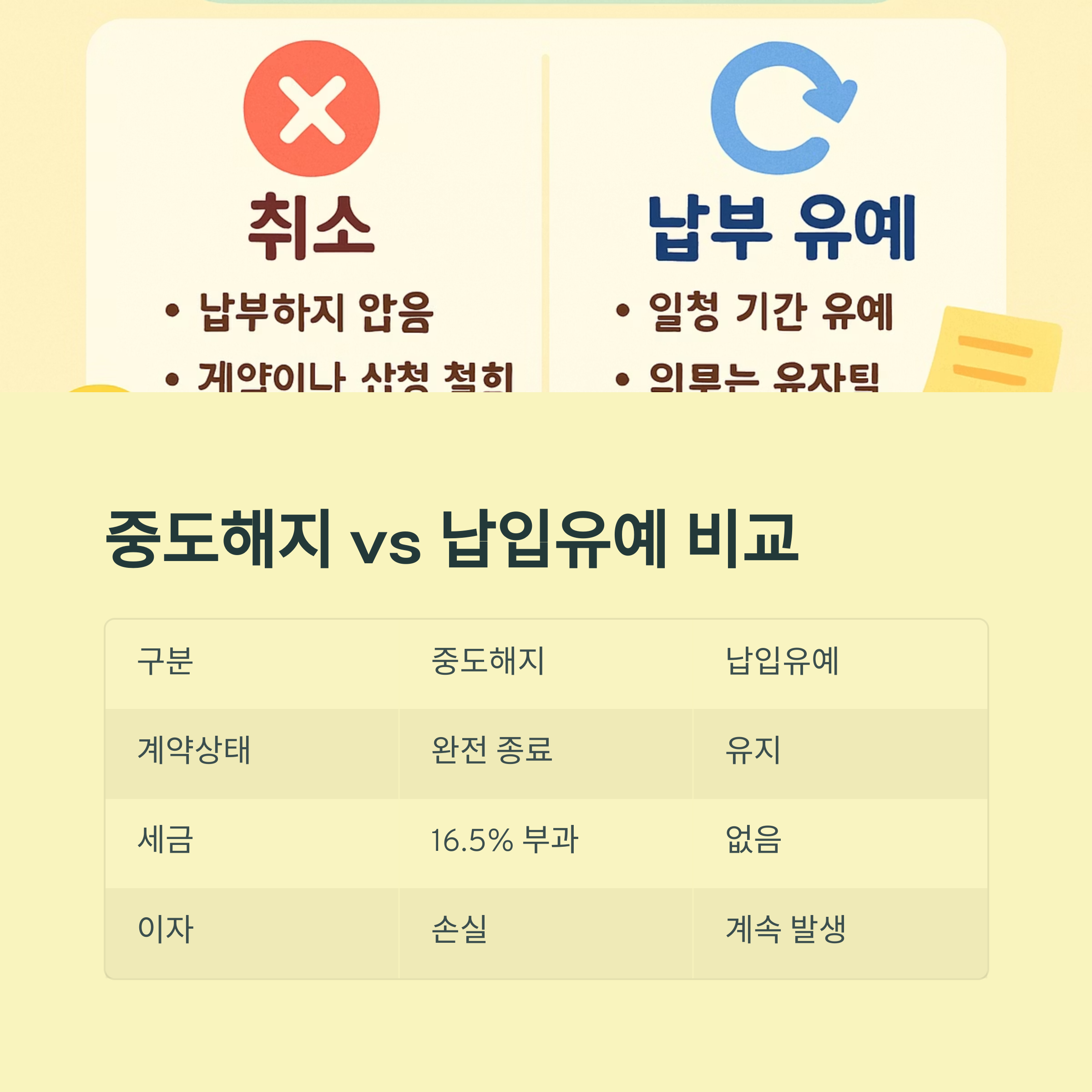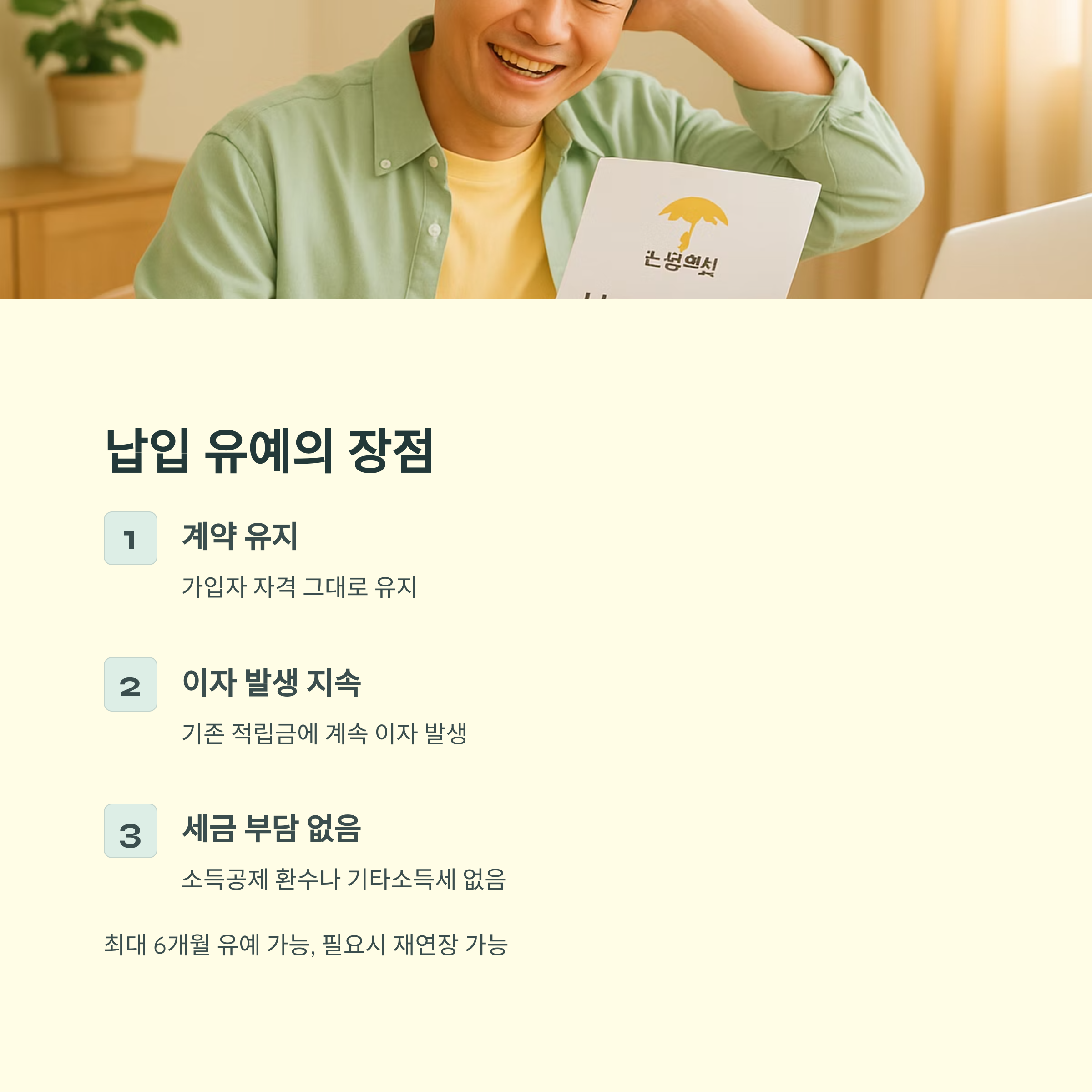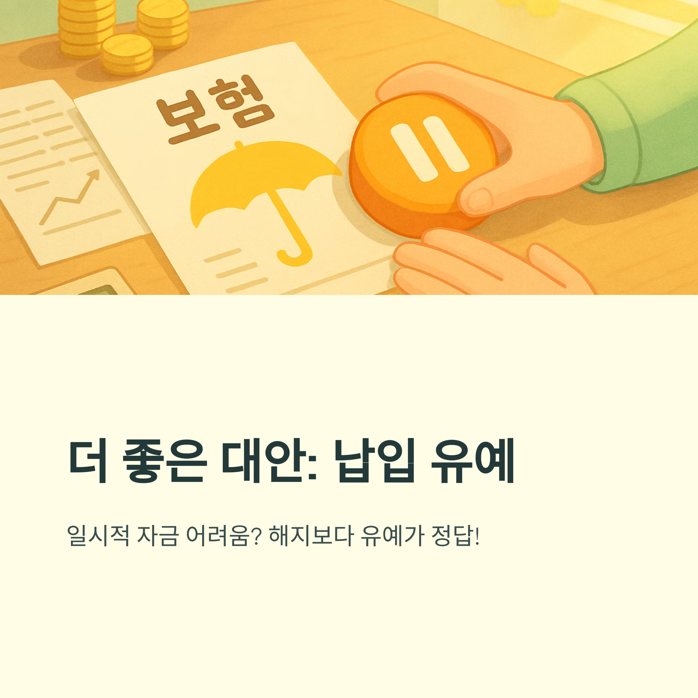 자금 사정이 일시적으로 어려운 경우에는 중도해지 대신 유예가 훨씬 유리합니다.