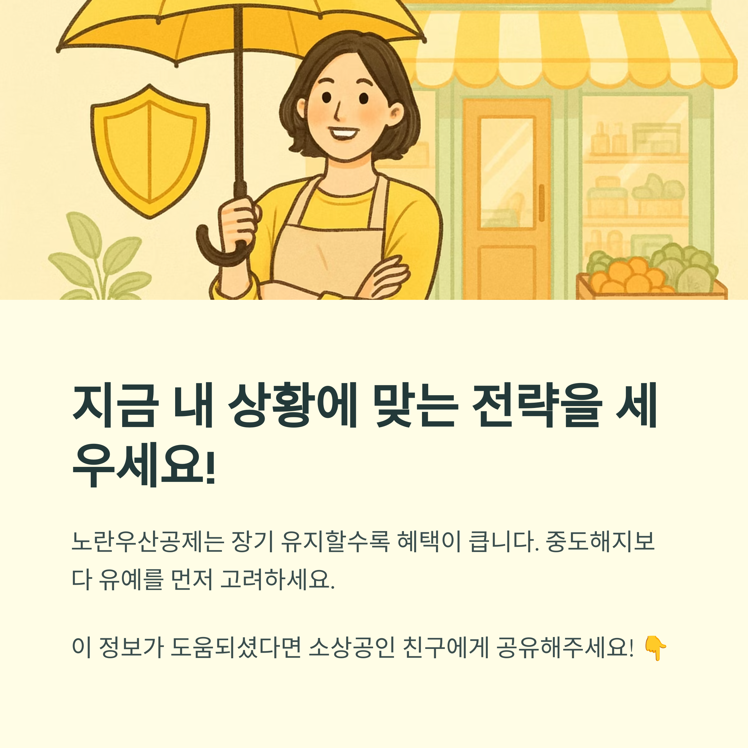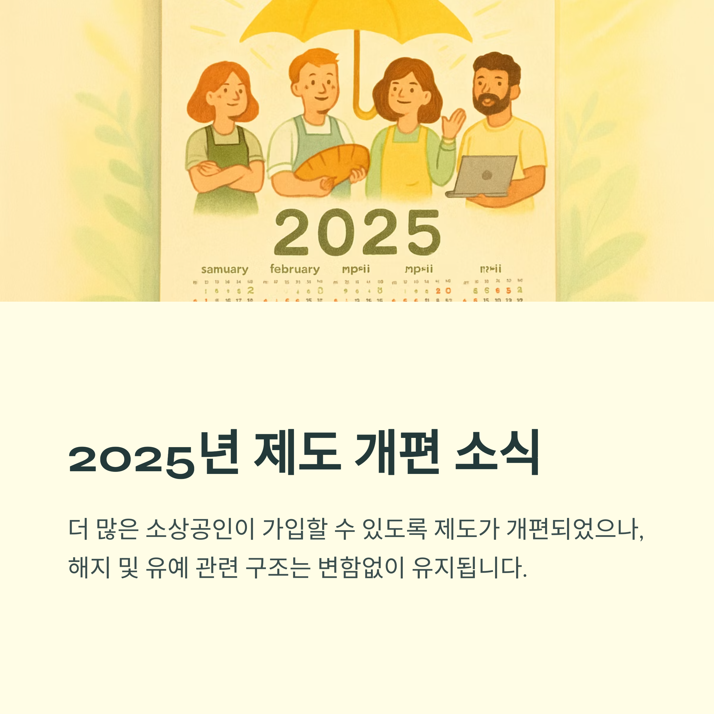 2025년 제도 개편으로 더 많은 소상공인이 가입할 수 있게 되었고, 해지 및 유예 관련 구조는 변함없이 유지되고 있습니다.