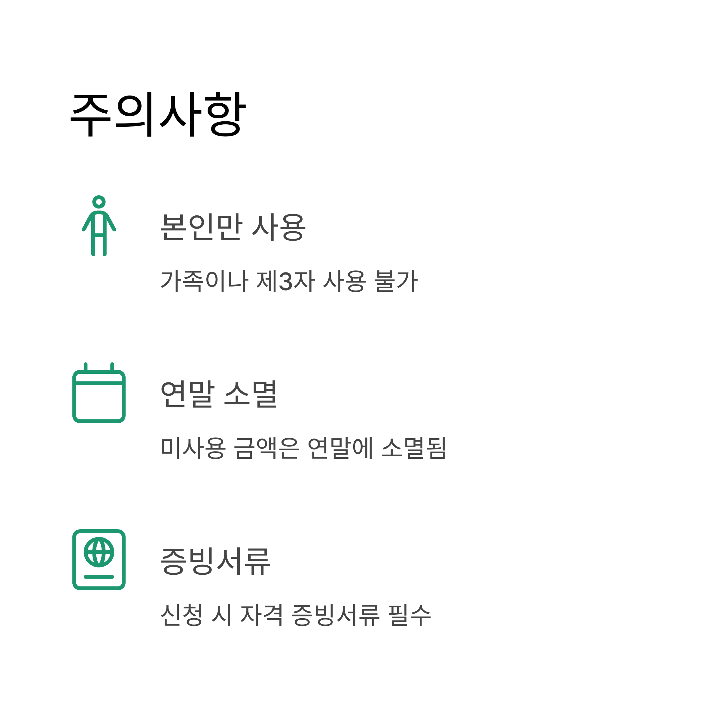 - 본인만 사용 가능, 가족이나 제3자 사용 불가