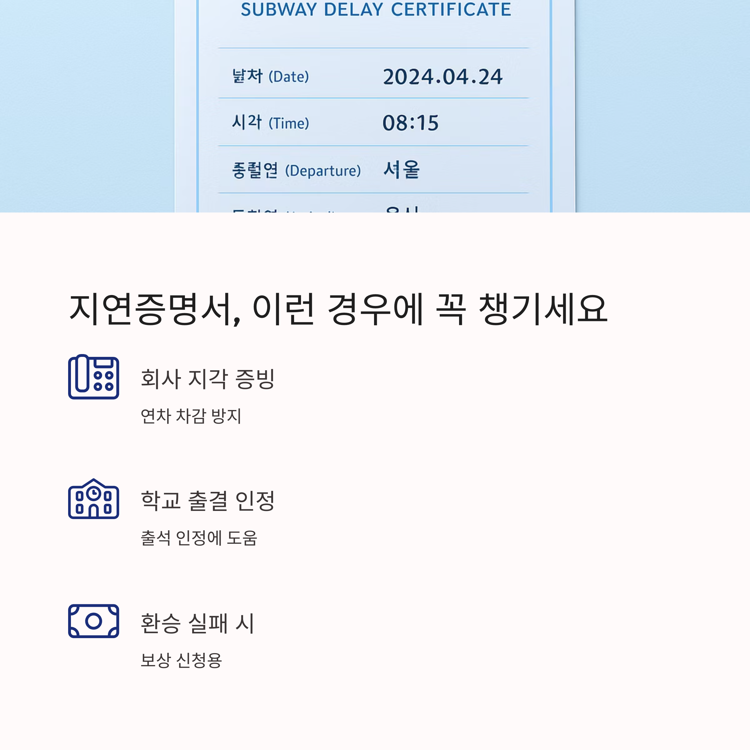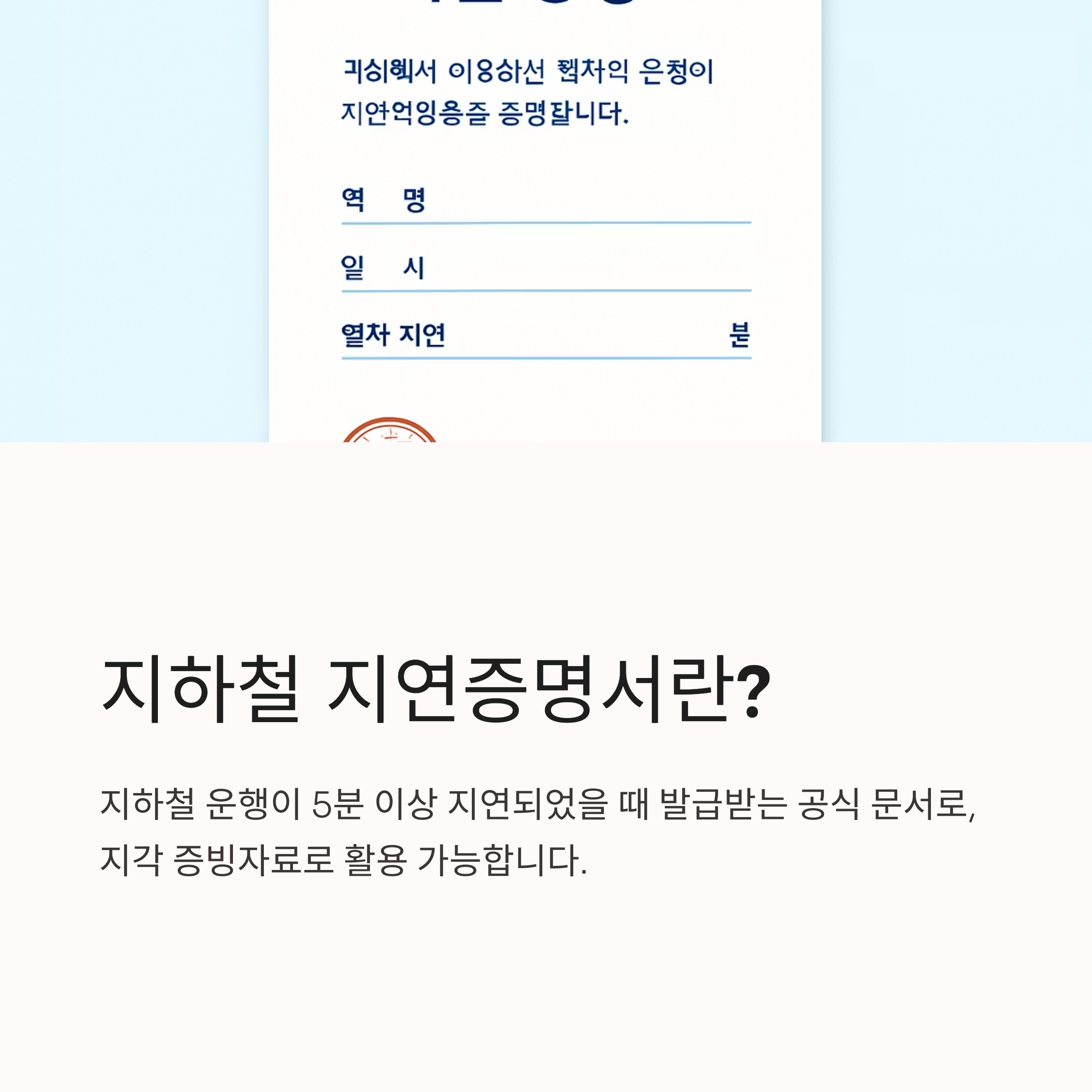 지하철 운행이 일정 시간 이상 지연되었을 때, 회사나 학교에 지각 증빙 자료로 제출할 수 있는 공식 문서입니다.