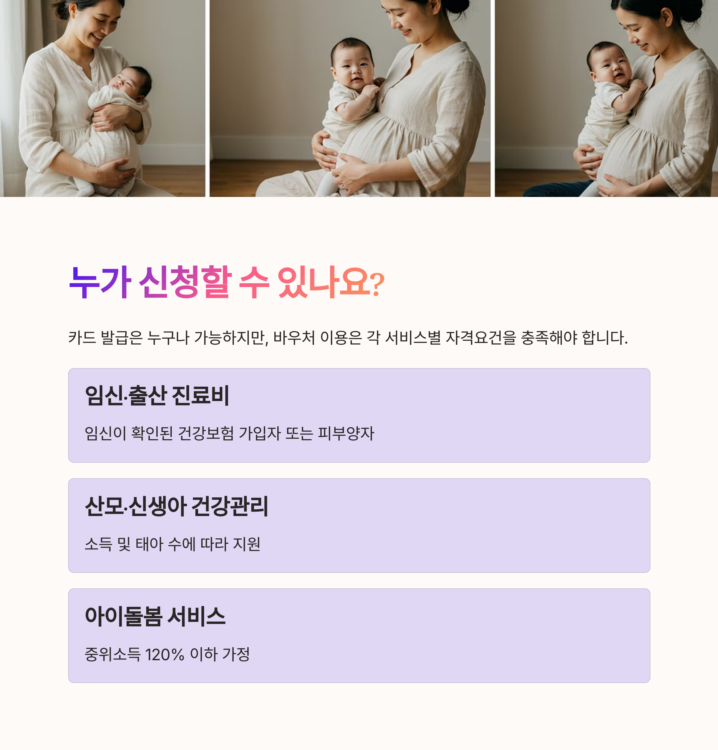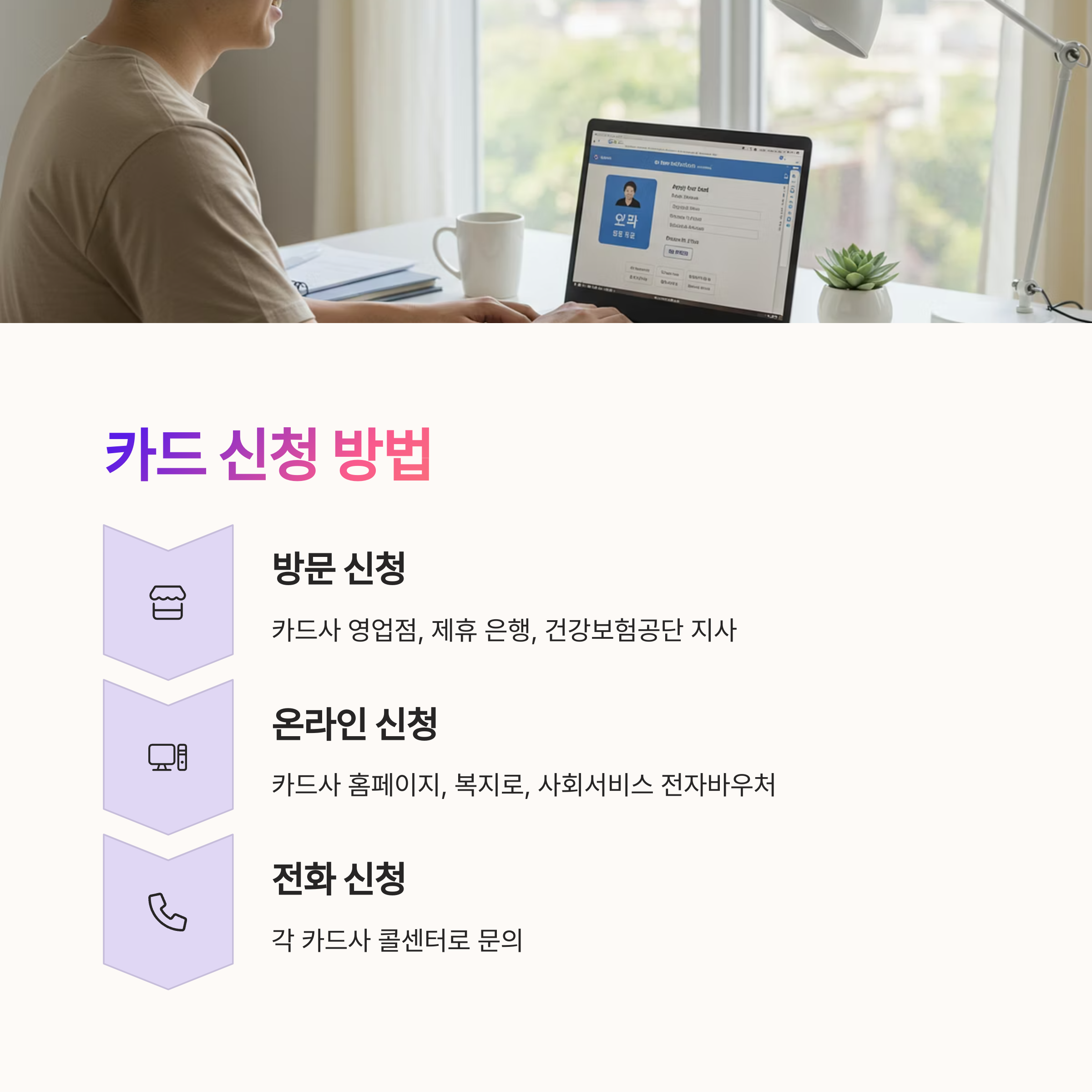 - 온라인 신청: 카드사 홈페이지, 복지로(www.bokjiro.go.kr), 사회서비스 전자바우처(www.socialservice.or.kr)