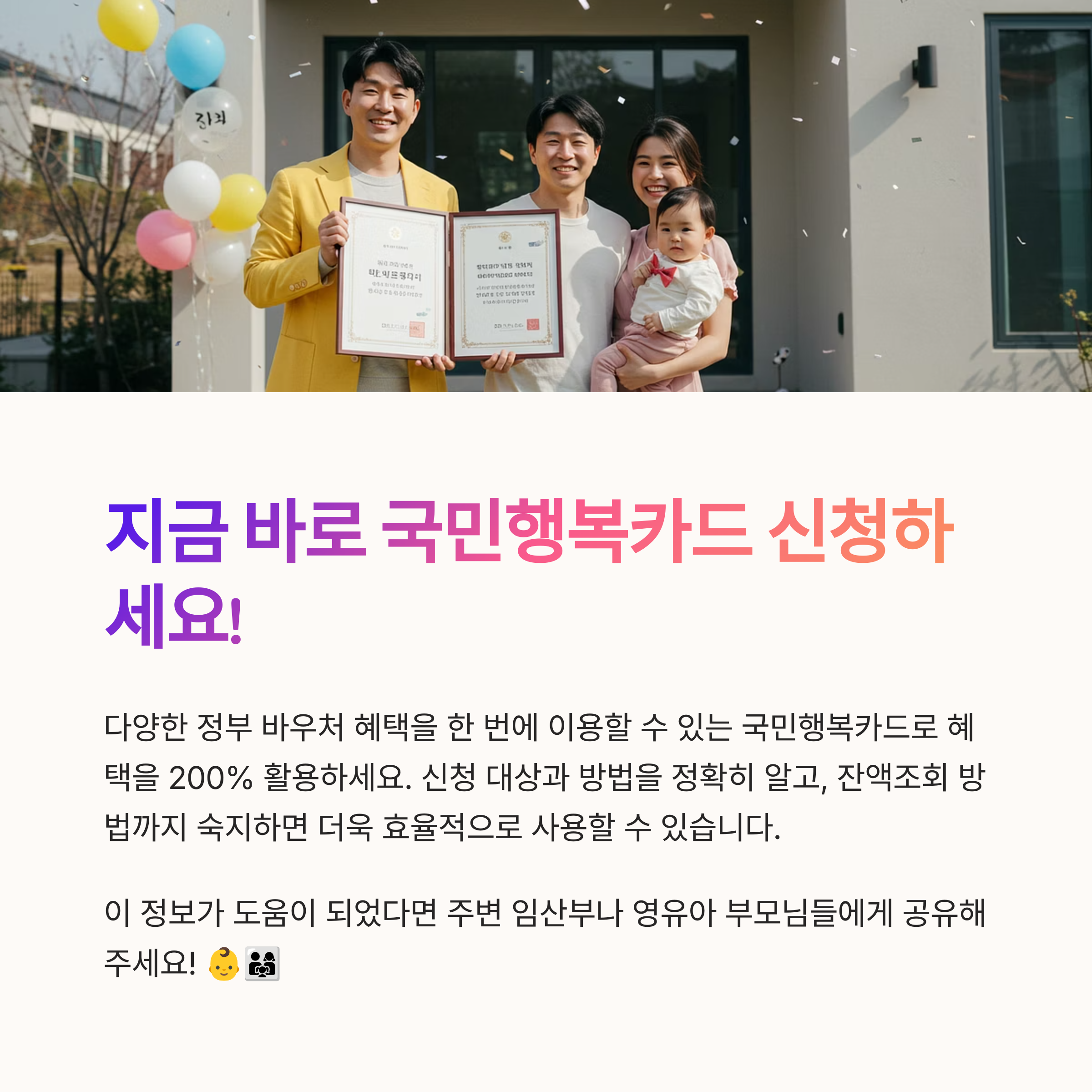 국민행복카드는 다양한 정부 바우처 혜택을 한 번에 이용할 수 있는 매우 유용한 카드입니다. 신청 대상과 방법을 정확히 알고, 국민행복카드 잔액조회 방법까지 숙지하면 혜택을 200% 활용할 수 있습니다. 오늘 바로 국민행복카드 신청하고, 지원 혜택을 꼭 챙기세요!