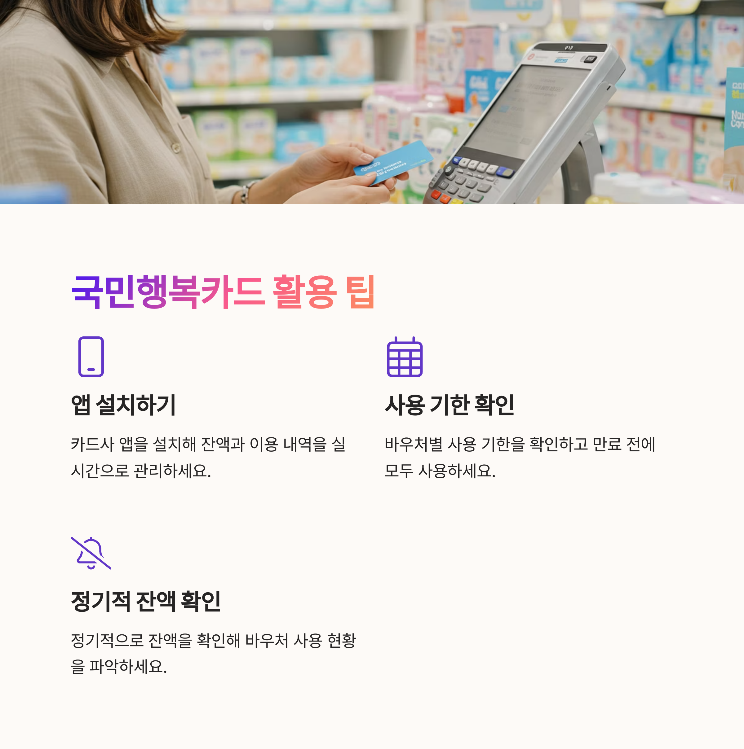카드 발급 자체에는 제한이 없지만, 바우처 이용은 아래 조건을 충족해야 가능합니다. 바우처 사용 후에는 정기적으로 국민행복카드 잔액조회를 통해 남은 금액을 확인하는 것이 중요합니다. 신청 대상이 되면 발급 후 즉시 잔액을 조회해 통해 지원금이 제대로 입금되었는지 확인해야 합니다.