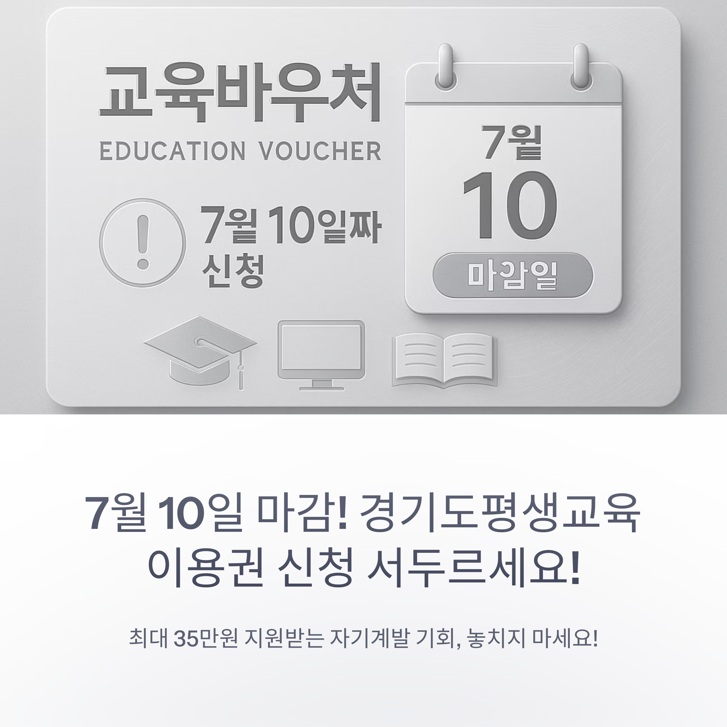 2025년 제2차 경기도평생교육이용권 신청 마감일(7월 10일)이 얼마 남지 않았습니다.