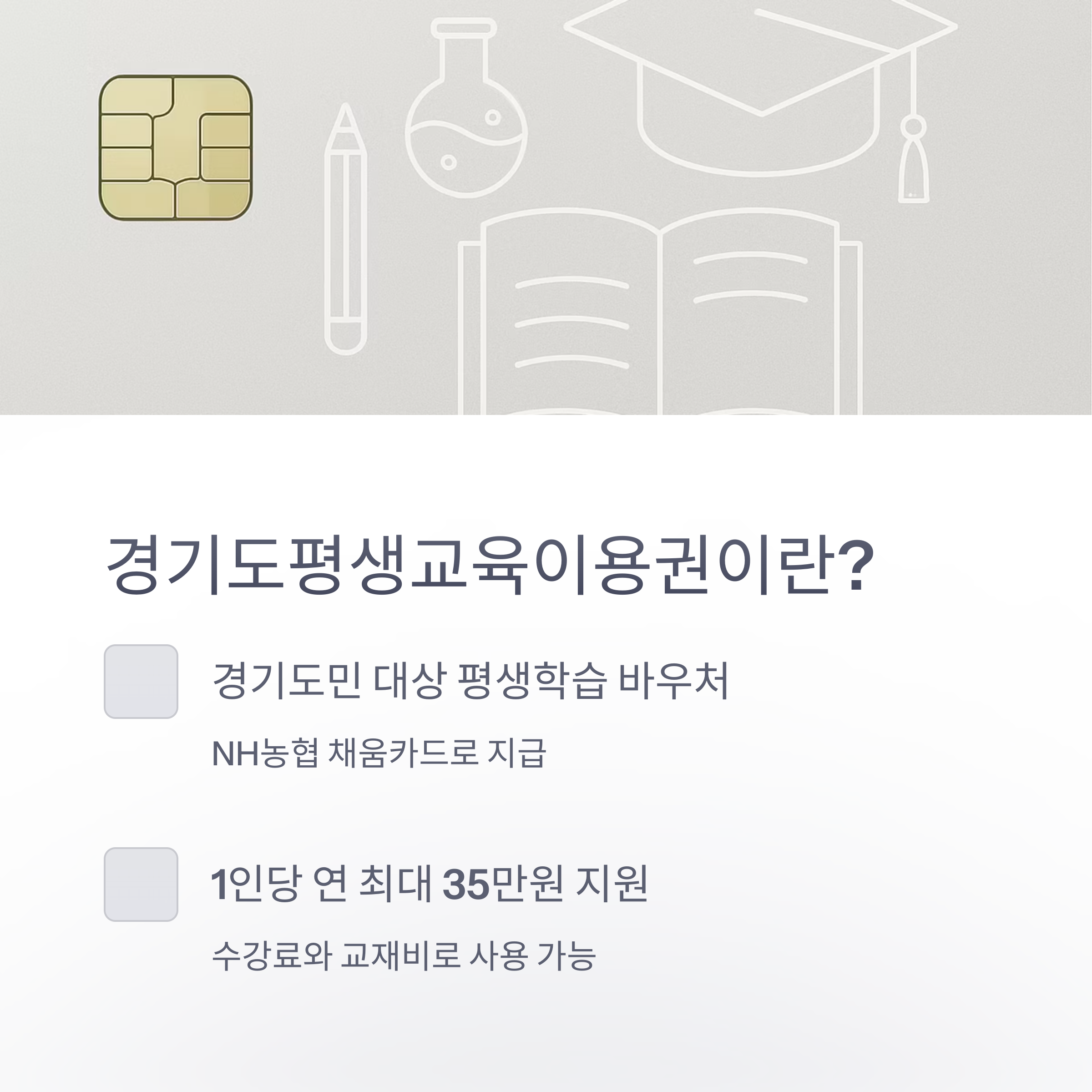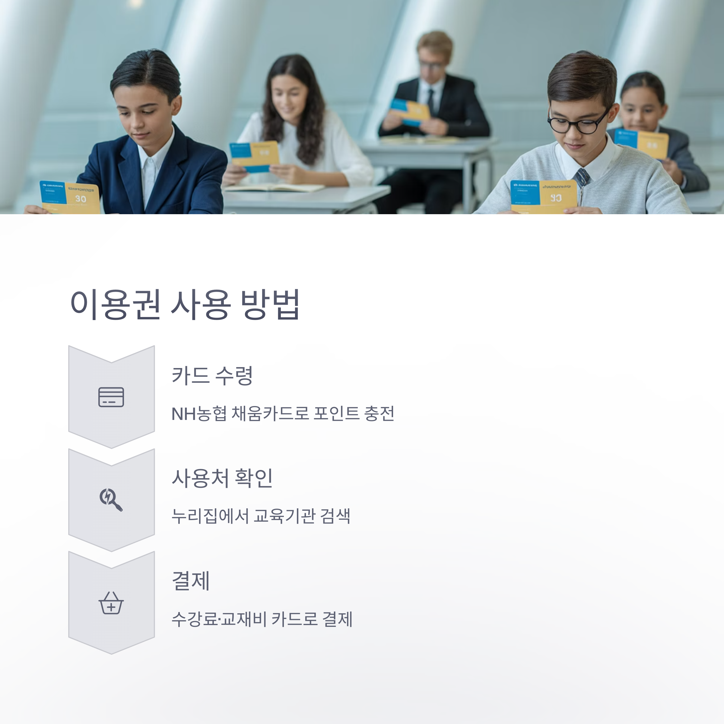 다양한 교육 기관에서 수강료와 교재비로 사용할 수 있는 포인트를 NH농협 채움카드로 지급받게 됩니다.