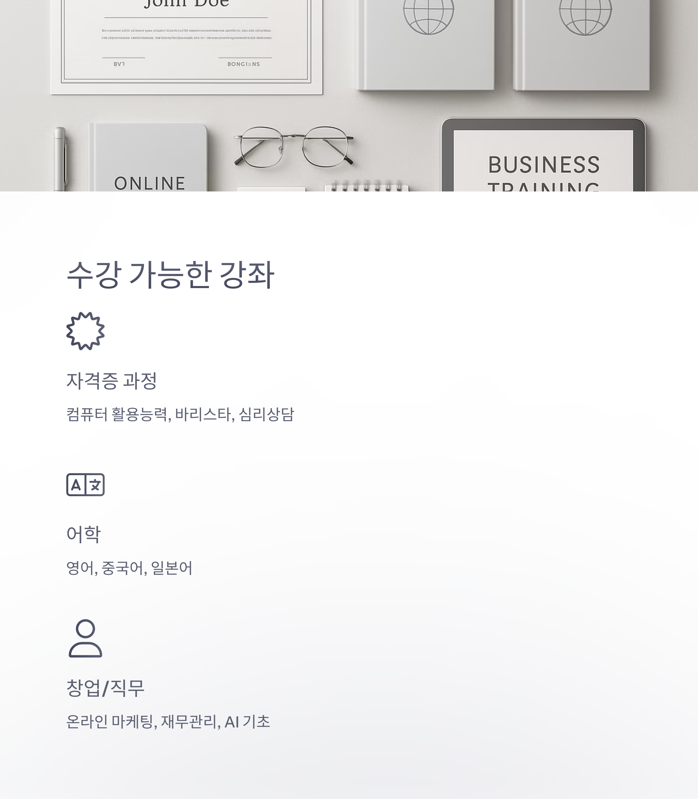 - 자격증 과정: 컴퓨터 활용능력, 바리스타, 심리상담 등
