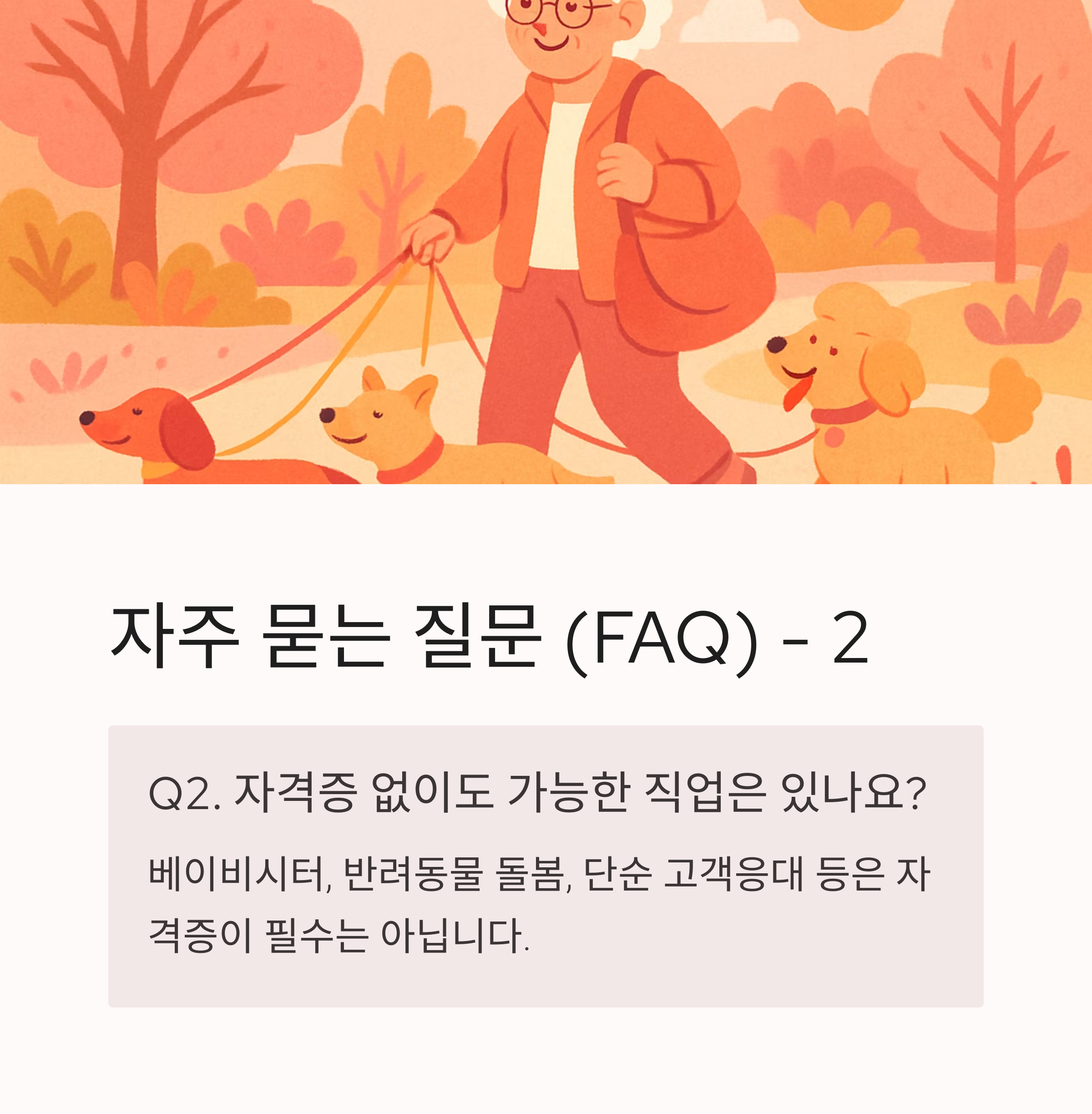 A: 베이비시터, 반려동물 돌봄, 단순 고객응대 등은 자격증이 필수는 아니지만, 관련 교육 수료 시 신뢰도가 높아집니다.