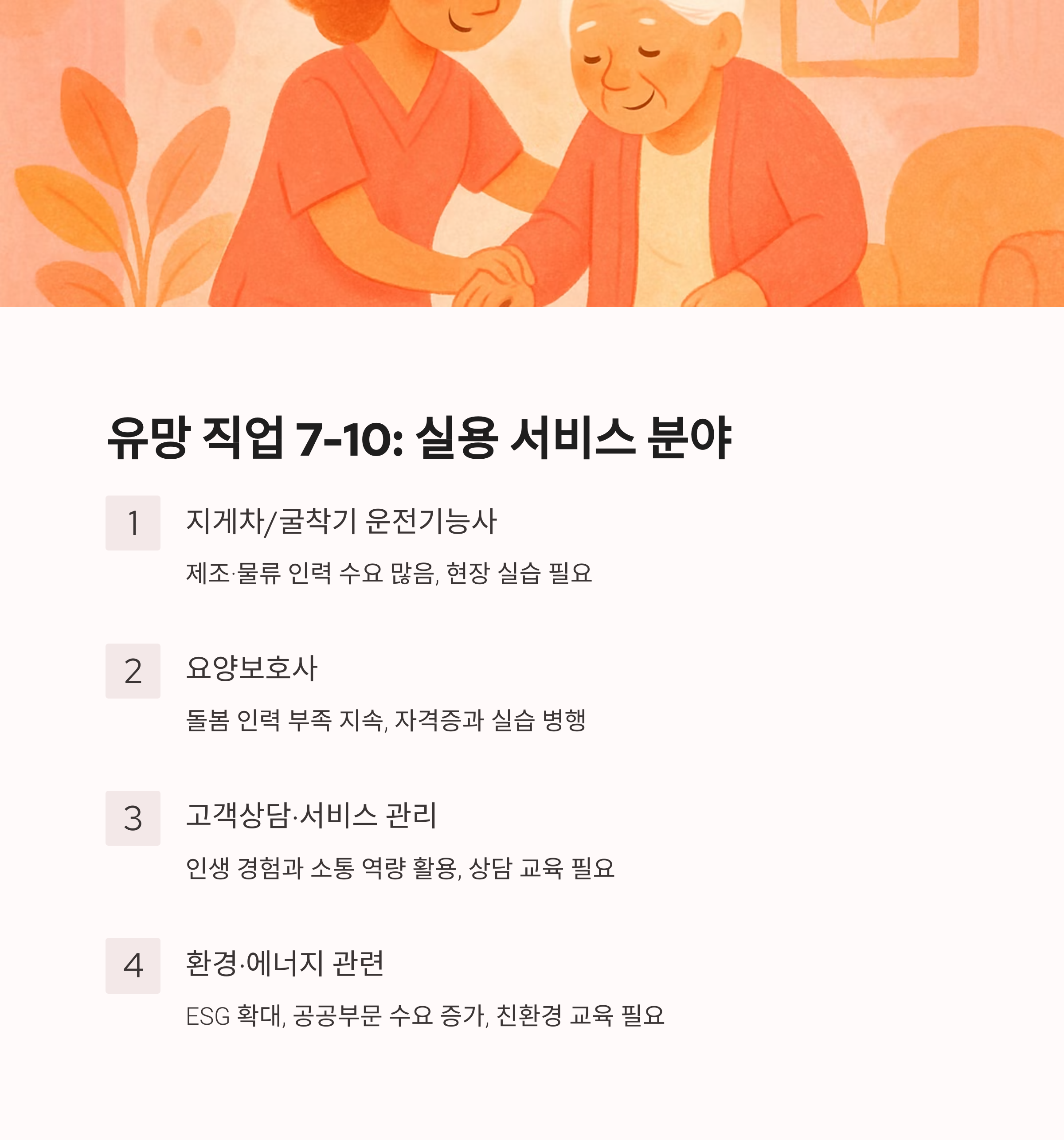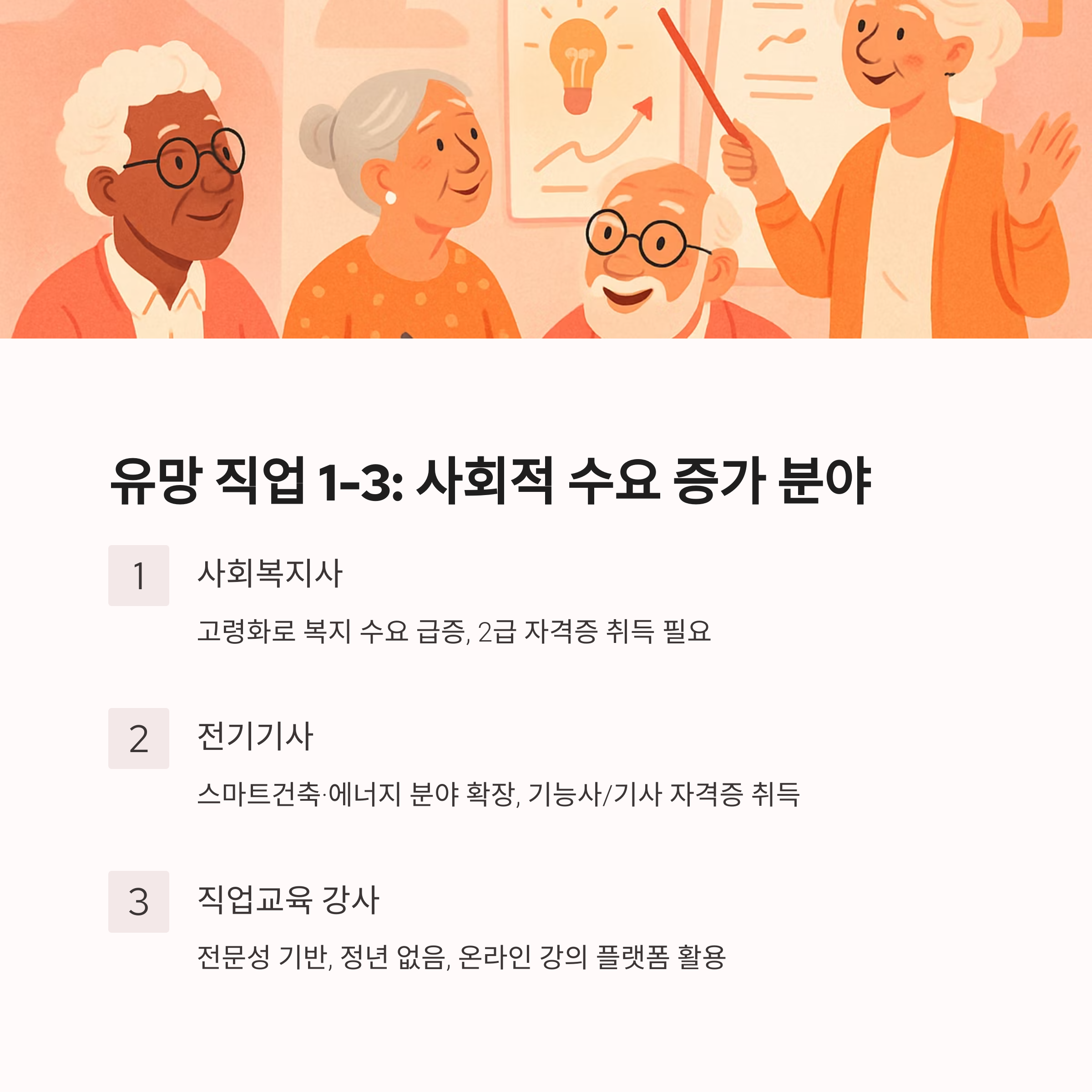 | 사회복지사 | 고령화로 복지 수요 급증 | 2급 자격증 취득, 평생교육원 수강 |