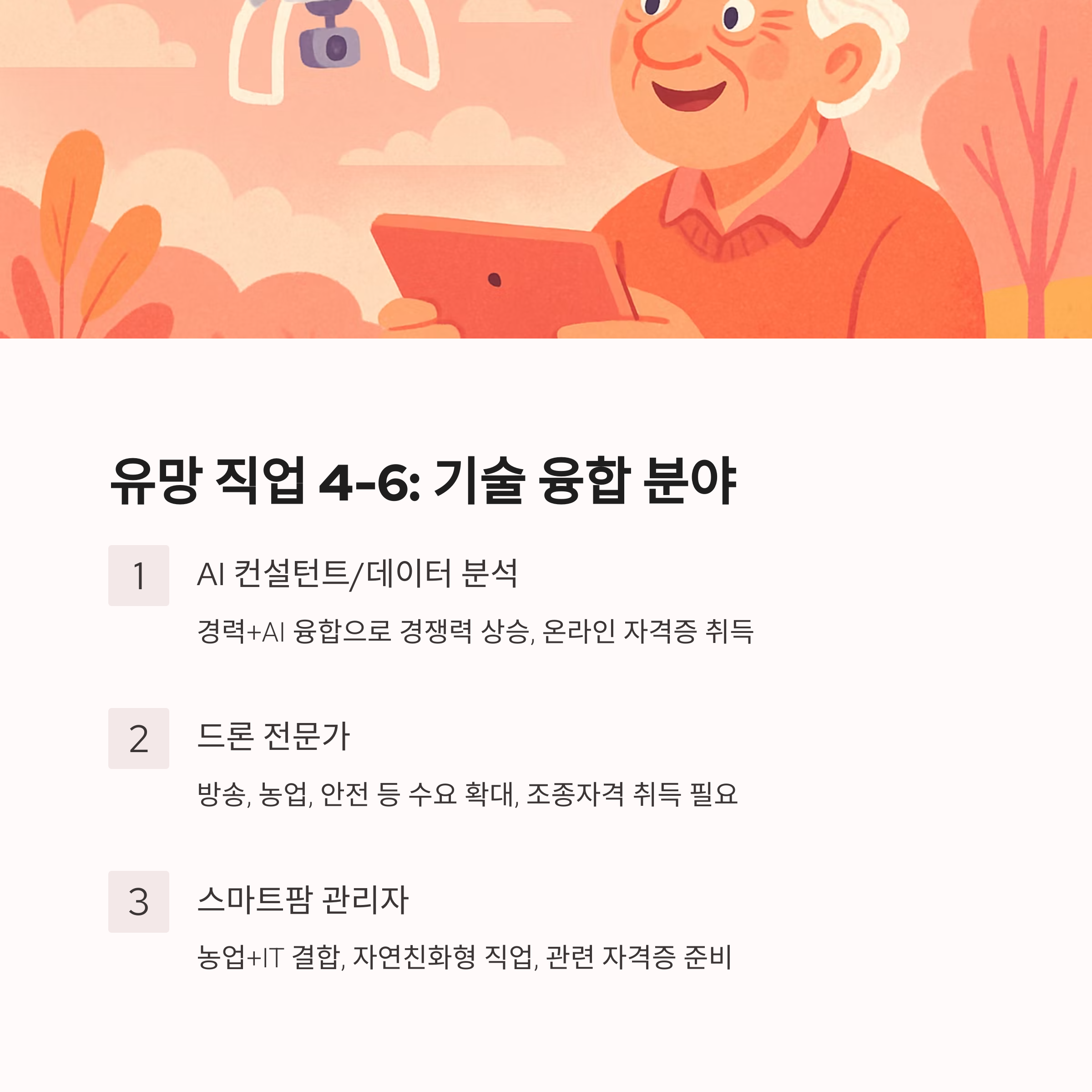 | AI 컨설턴트/데이터 분석 | 은퇴자 경력+AI 융합으로 경쟁력↑ | AI/데이터 분석 교육 수강, 온라인 자격증 취득 |