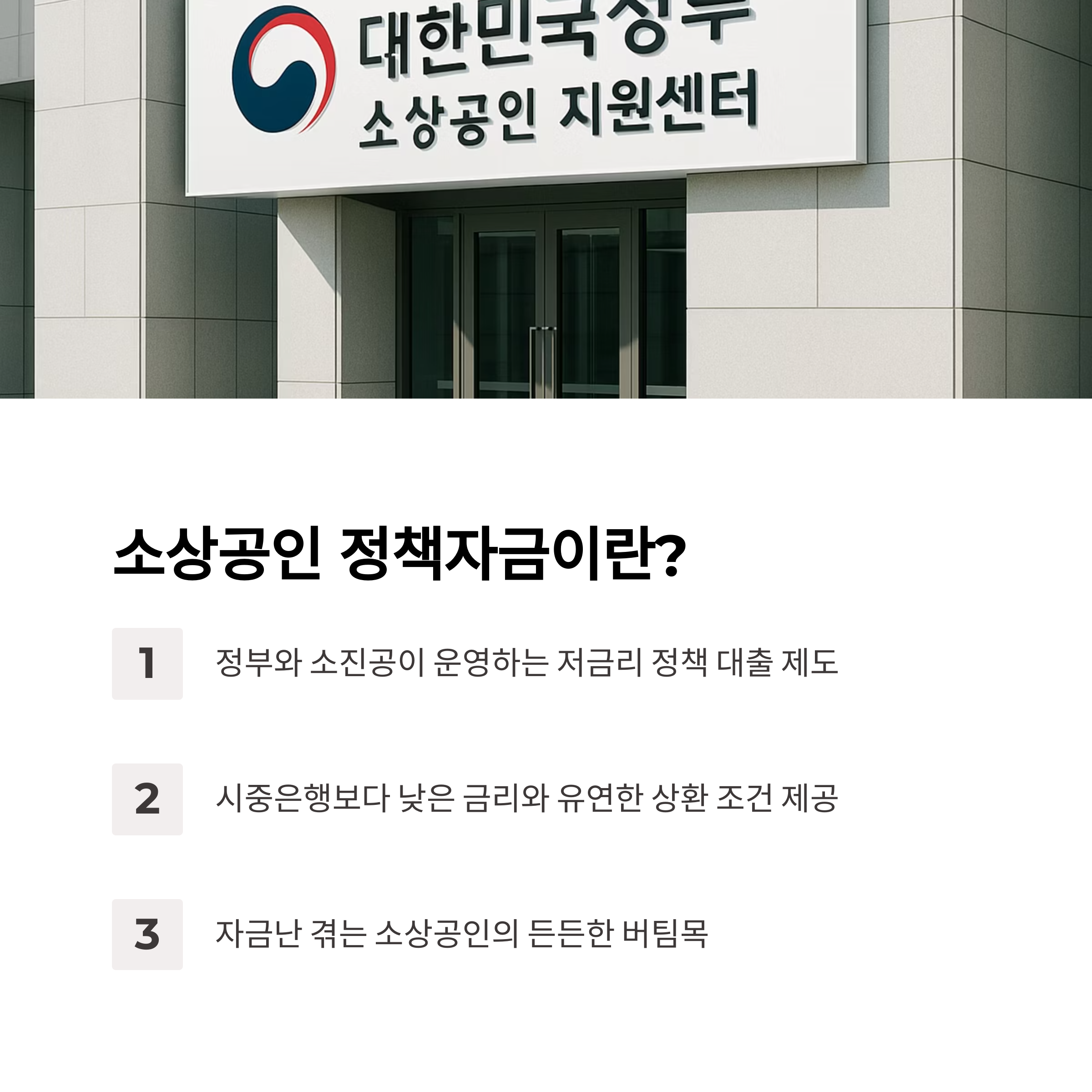 일반 시중은행 대출보다 낮은 금리와 유연한 상환 조건이 강점으로, 자금난을 겪는 소상공인에게 든든한 버팀목이 됩니다.