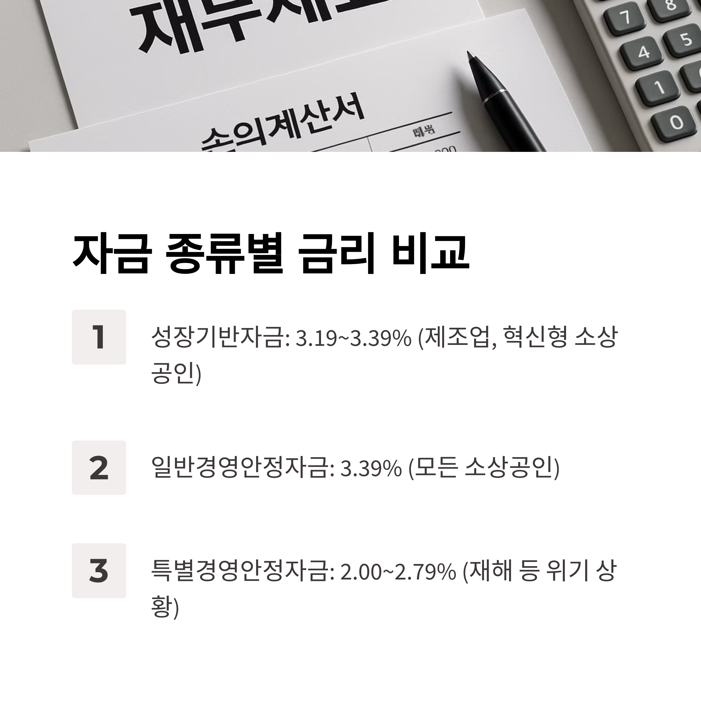 | 성장기반자금 | 제조업, 혁신형 소상공인 | 3.19~3.39% |
