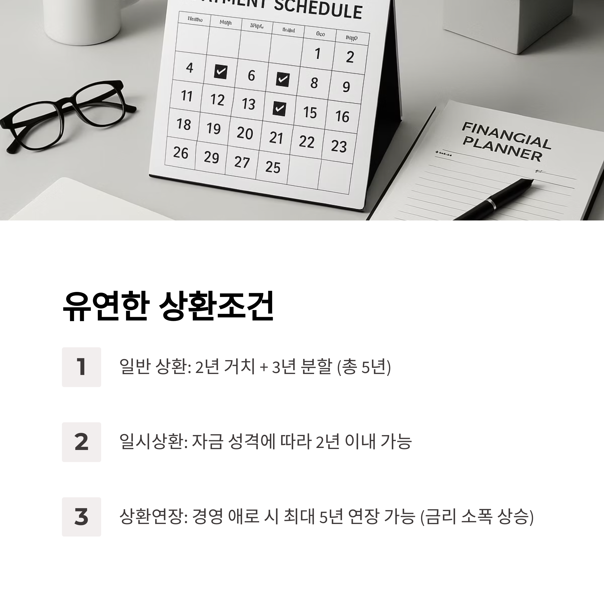 - 일시상환: 자금 성격에 따라 2년 이내 가능