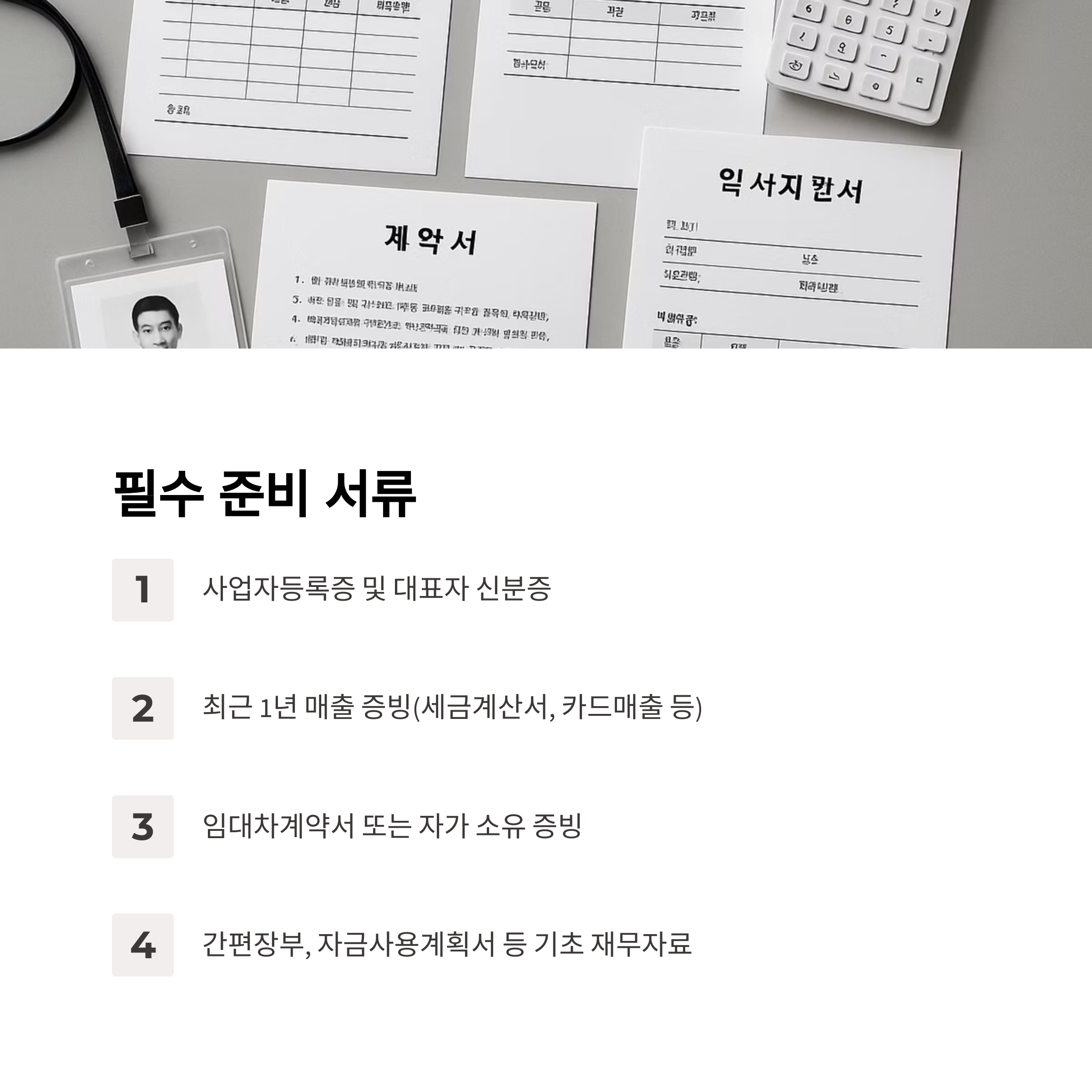 A4. 매출 증빙과 사업자등록증, 임대차계약서, 재무자료는 모든 자금에서 필수입니다.