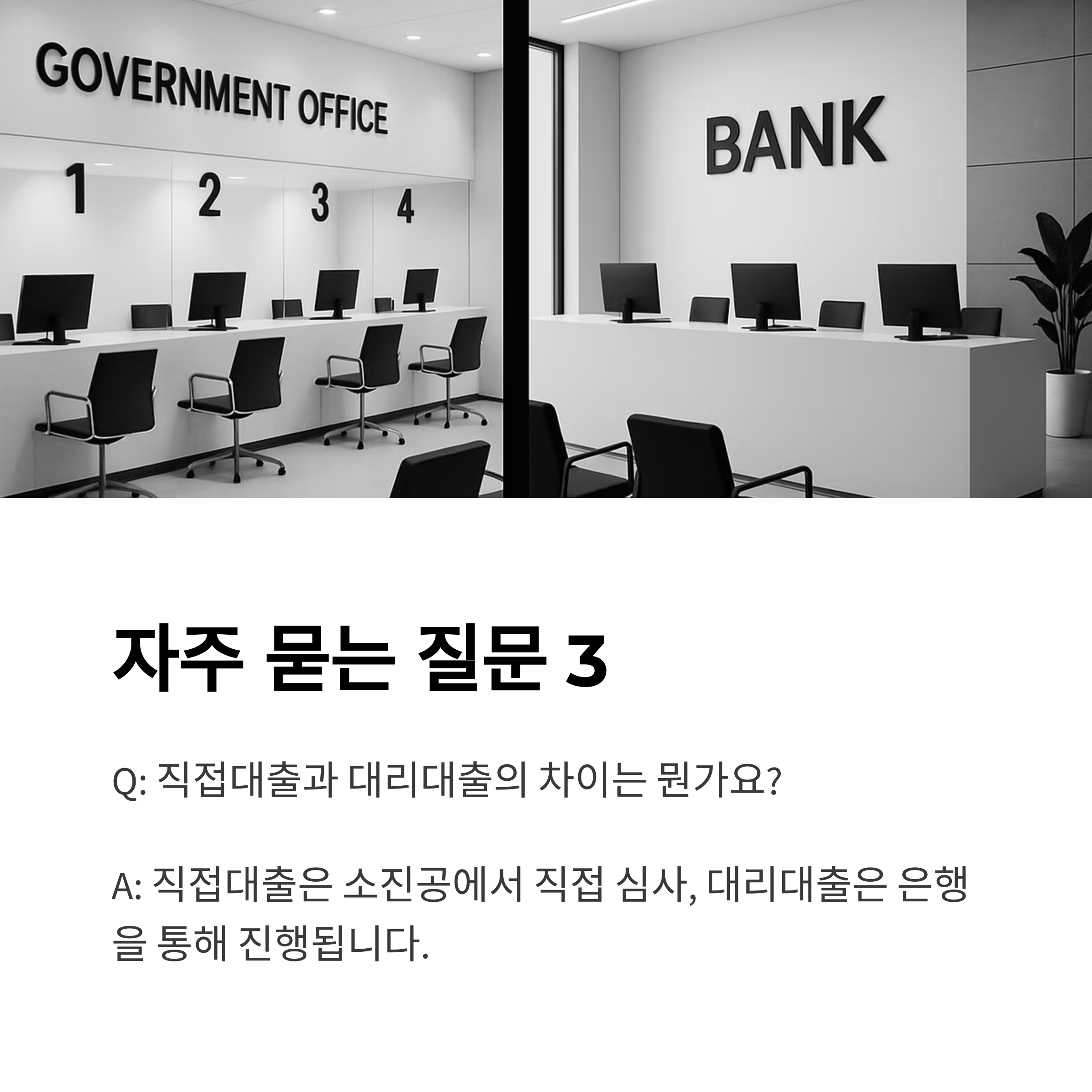 A3. 직접대출은 소진공에서 직접 심사 및 실행하며, 대리대출은 은행을 통해 진행됩니다.