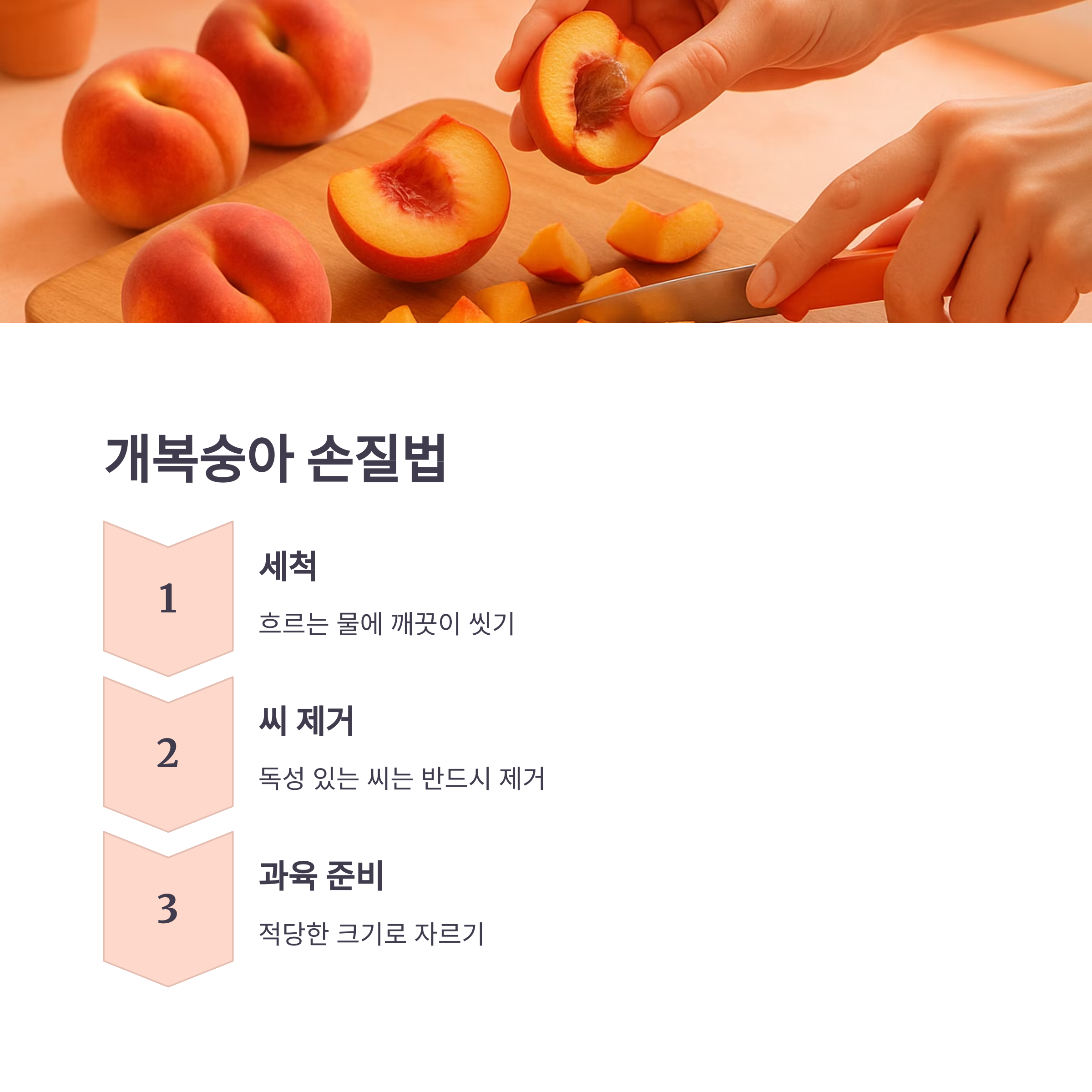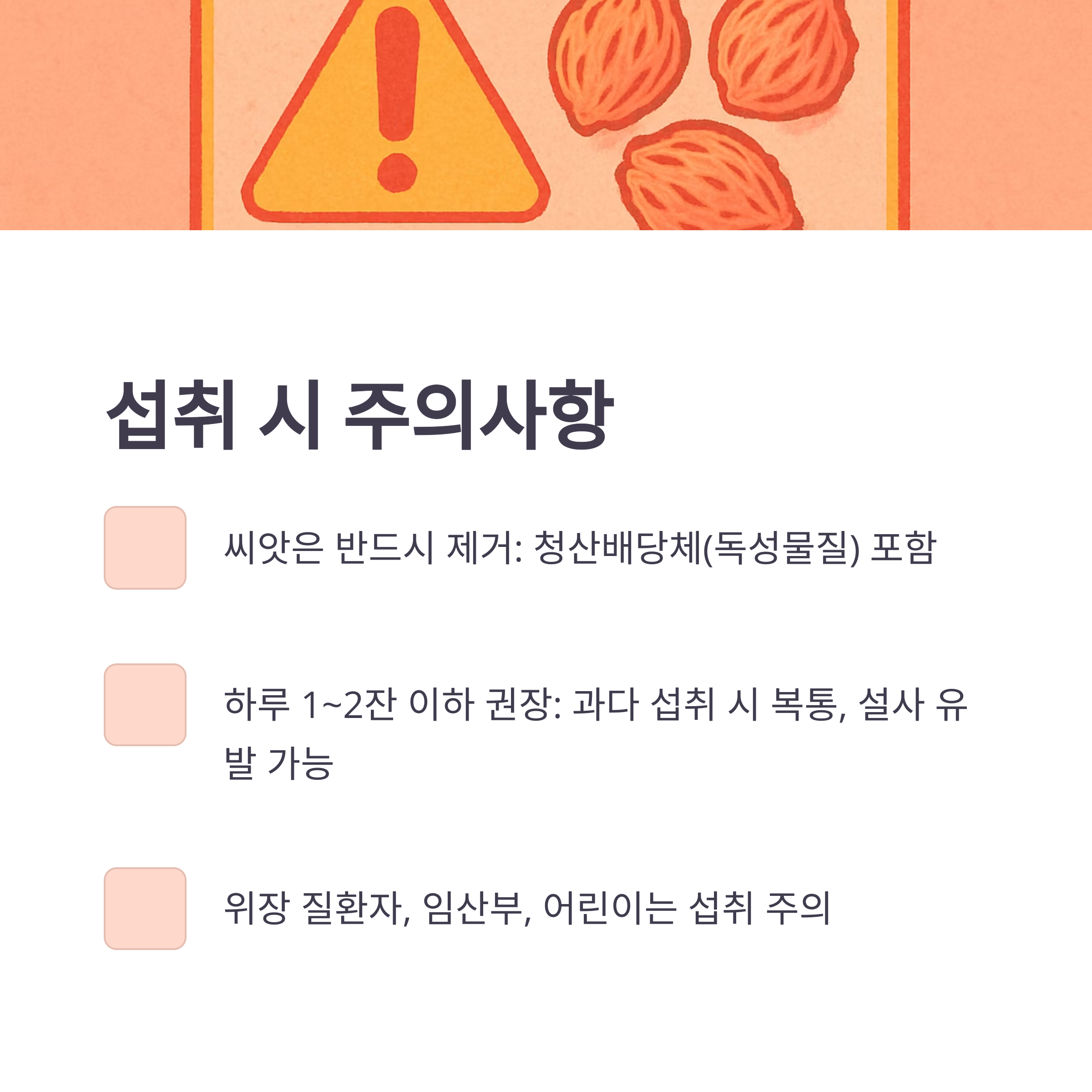 - 씨앗은 반드시 제거: 청산배당체(독성물질) 포함