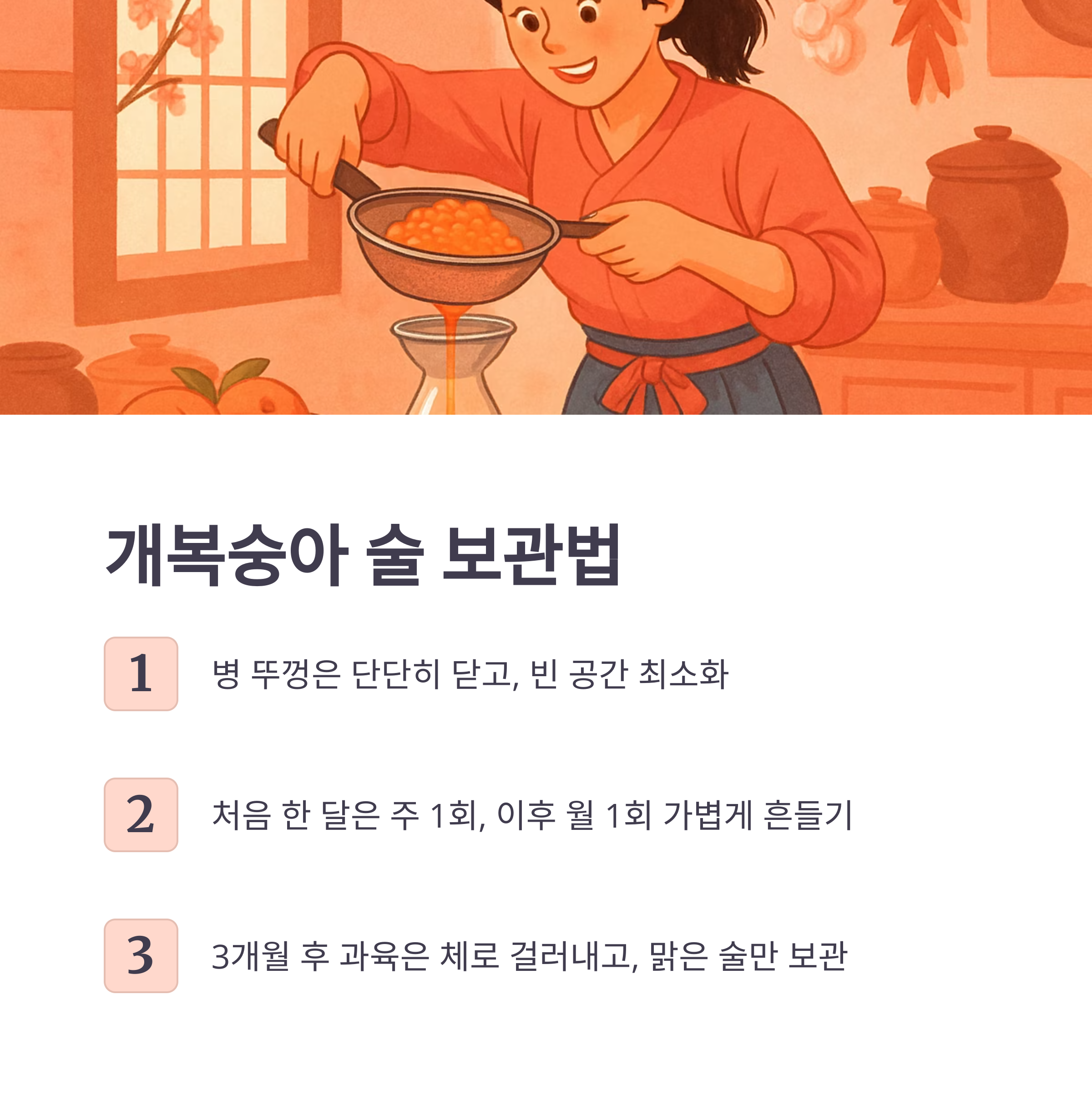 적절한 보관 방법은 개복숭아 술의 품질을 유지하는 데 매우 중요합니다.