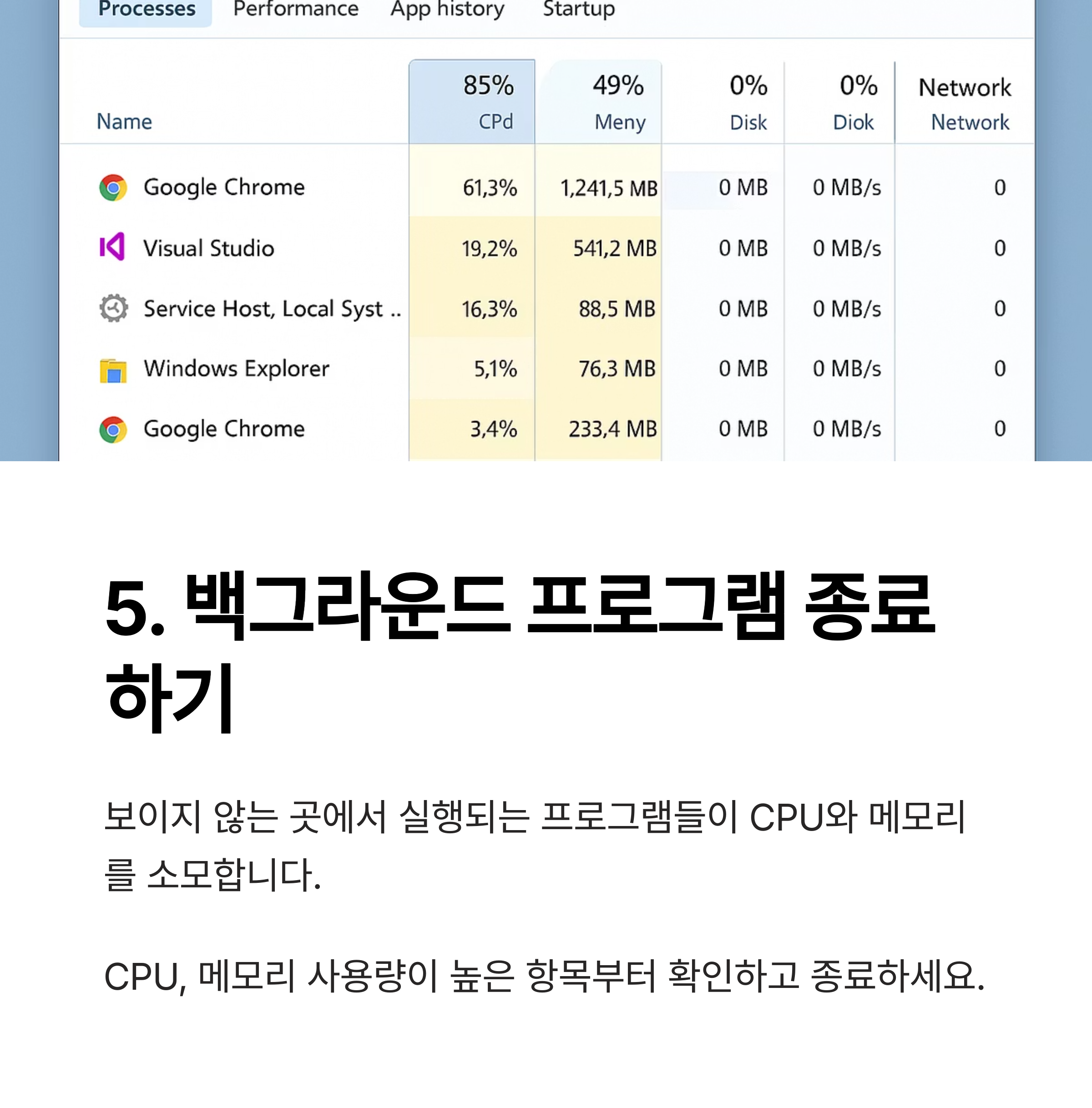 보이지 않는 곳에서 실행되는 백그라운드 프로그램들이 CPU와 메모리를 지속적으로 소모합니다.