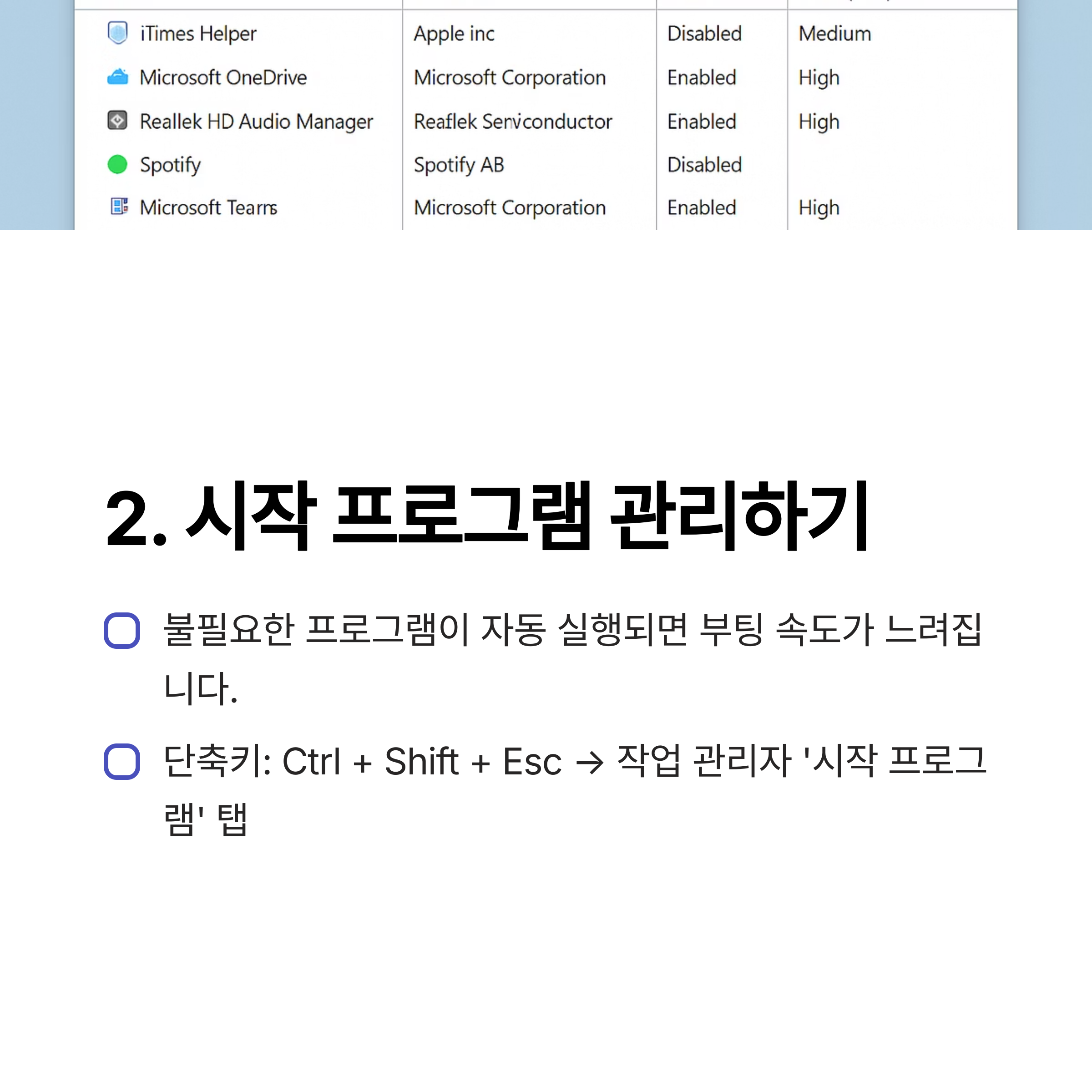 불필요한 프로그램이 자동 실행되지 않도록 설정하면 부팅 속도가 빨라집니다.