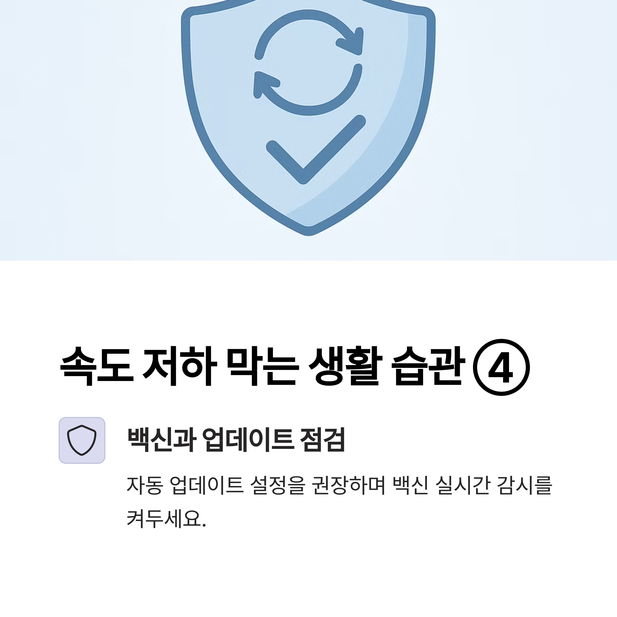 자동 업데이트 설정을 권장하며 백신 실시간 감시를 켜두세요. 지속적인 보안 관리가 시스템 안정성을 보장합니다.