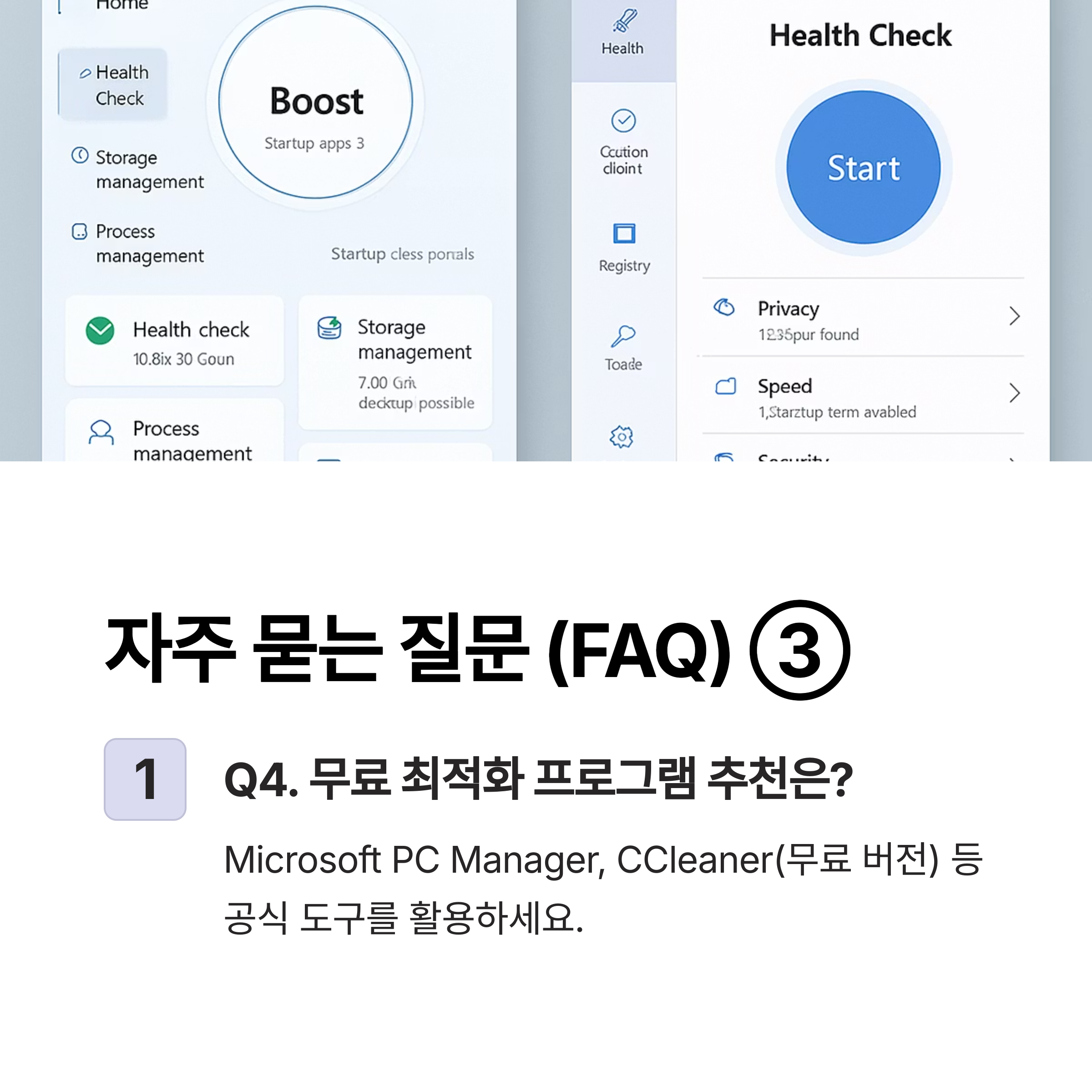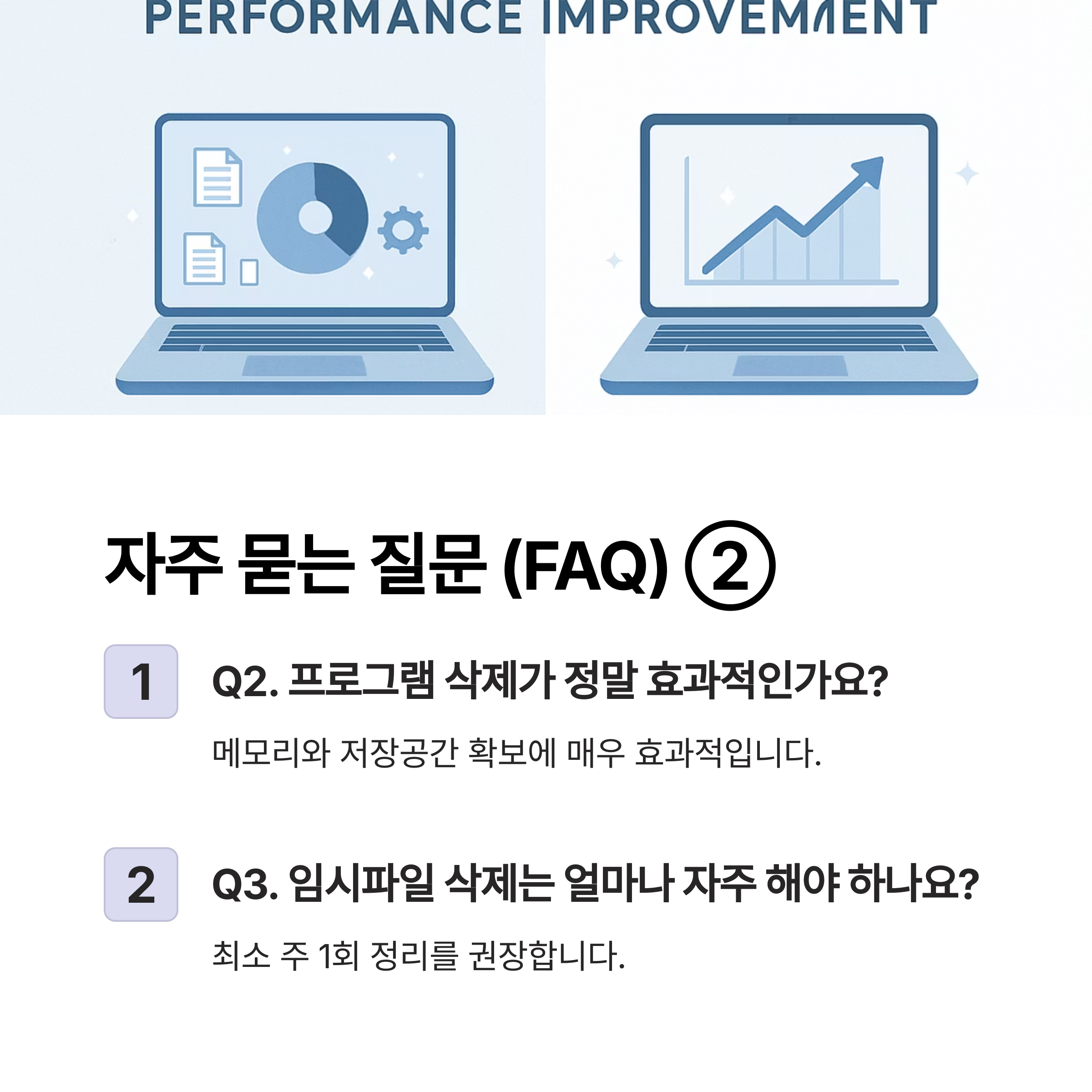 A4. Microsoft PC Manager, CCleaner(무료 버전) 등 공식 도구를 활용하세요.