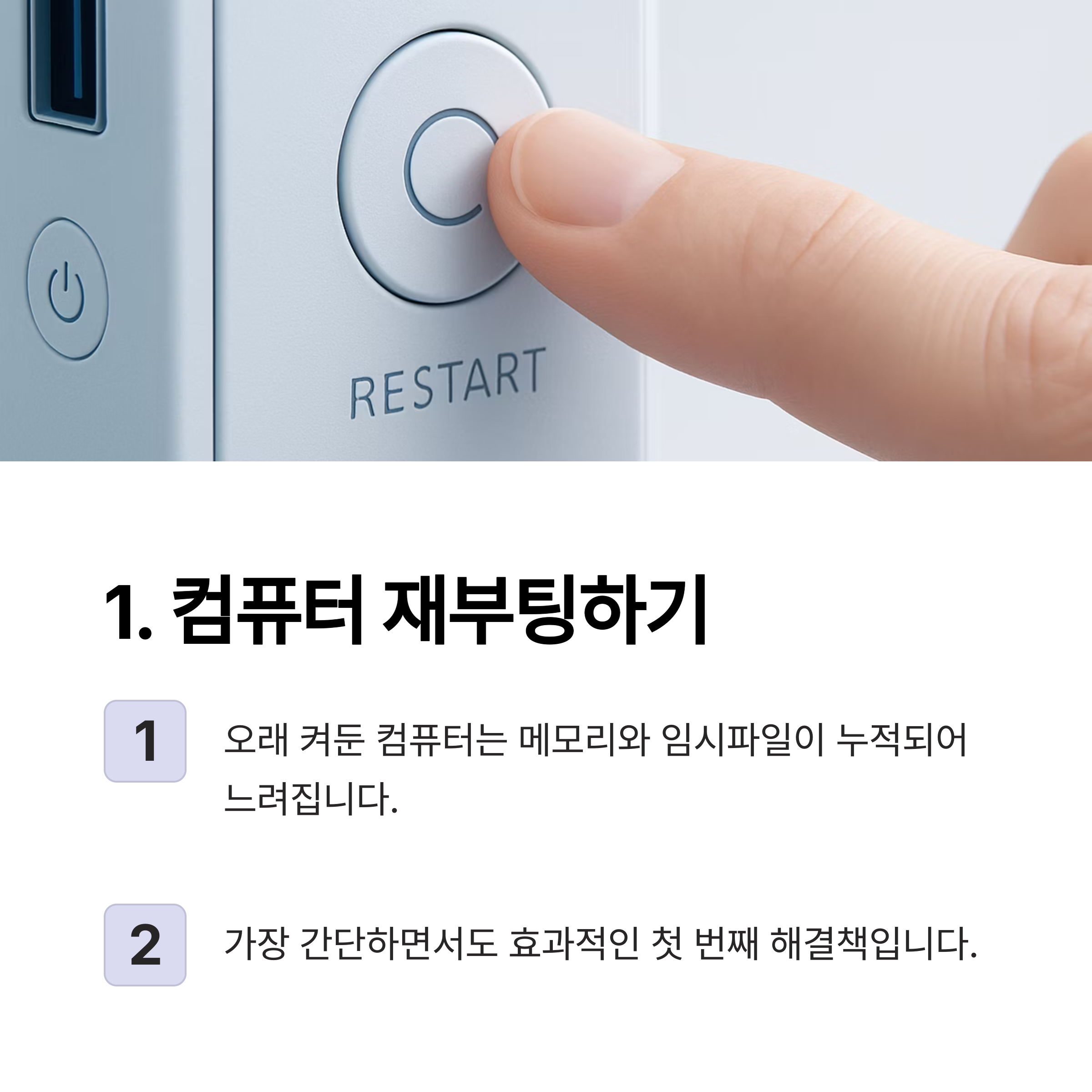 가장 간단하면서도 효과적인 방법으로, 컴퓨터 속도가 느려졌을때 가장 먼저 시도해볼 수 있는 해결책입니다.
