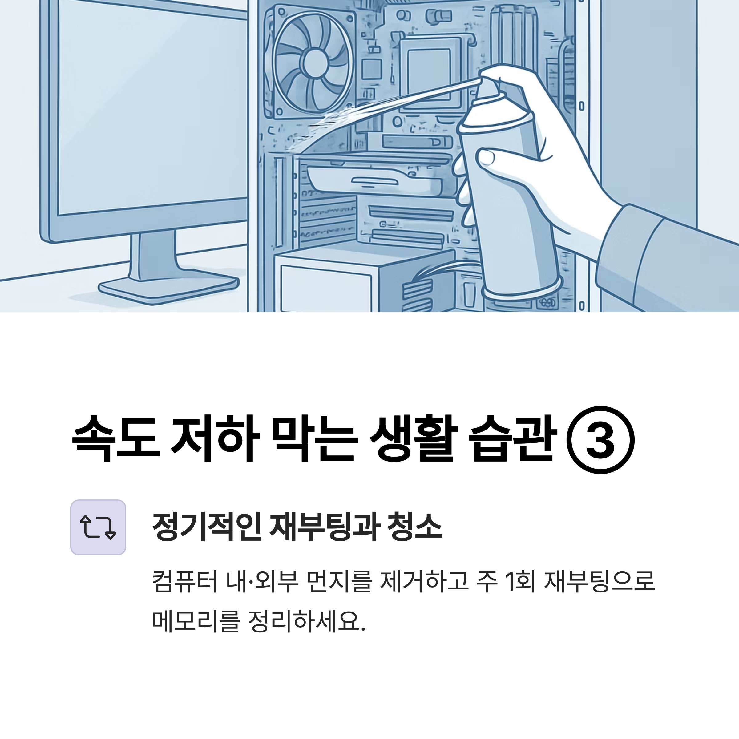 컴퓨터 내·외부 먼지를 제거하고 주 1회 재부팅으로 메모리를 정리하세요.