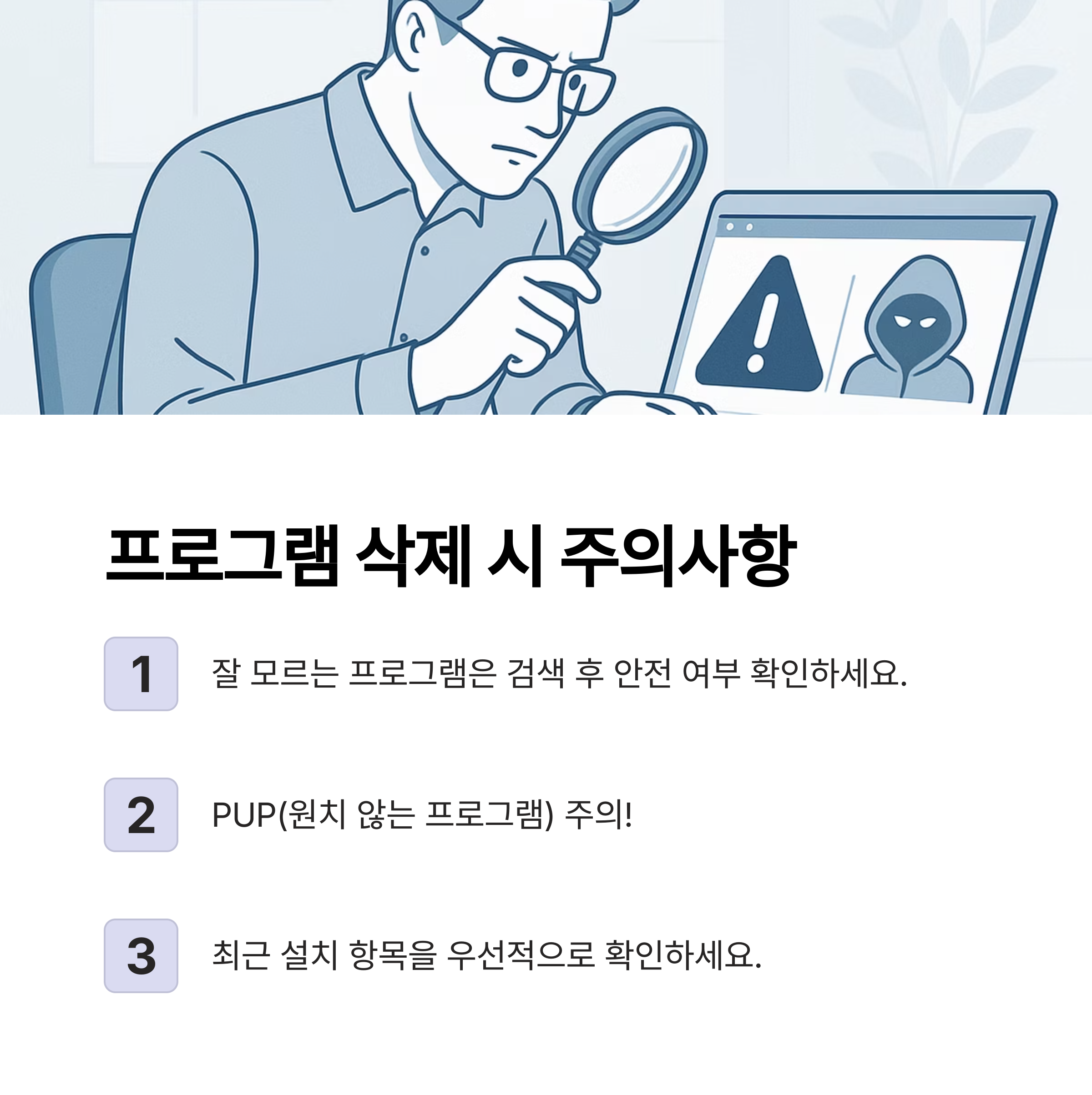 - 잘 모르는 프로그램은 검색 후 안전 여부 확인