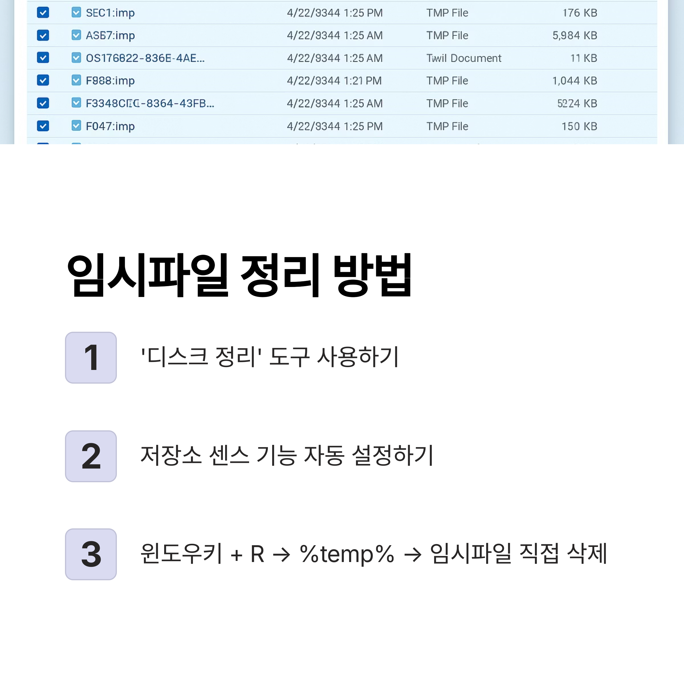 - 방법 3: 윈도우키 + R → %temp% → 임시파일 직접 삭제