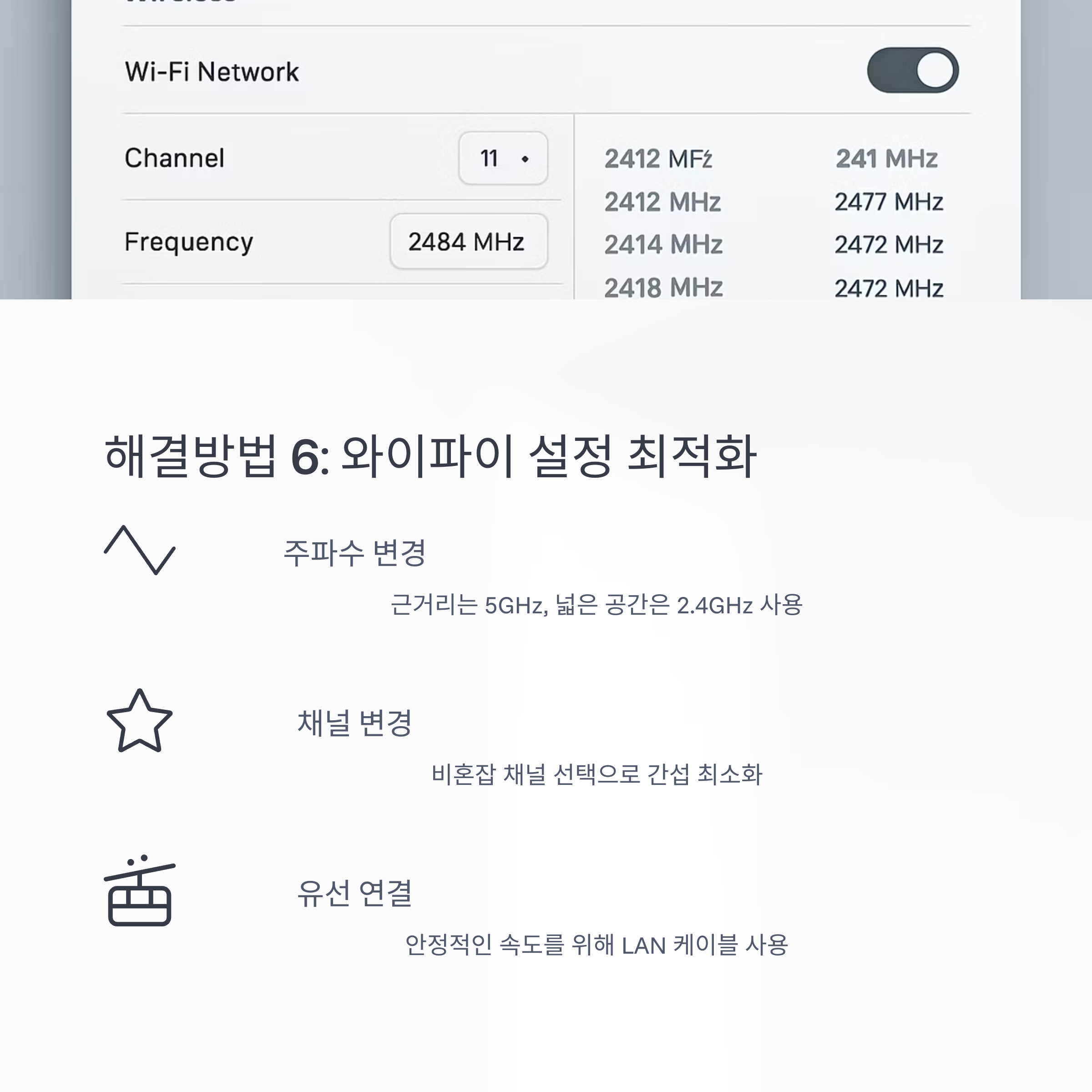 - 근거리에는 5GHz, 넓은 공간은 2.4GHz 적합
