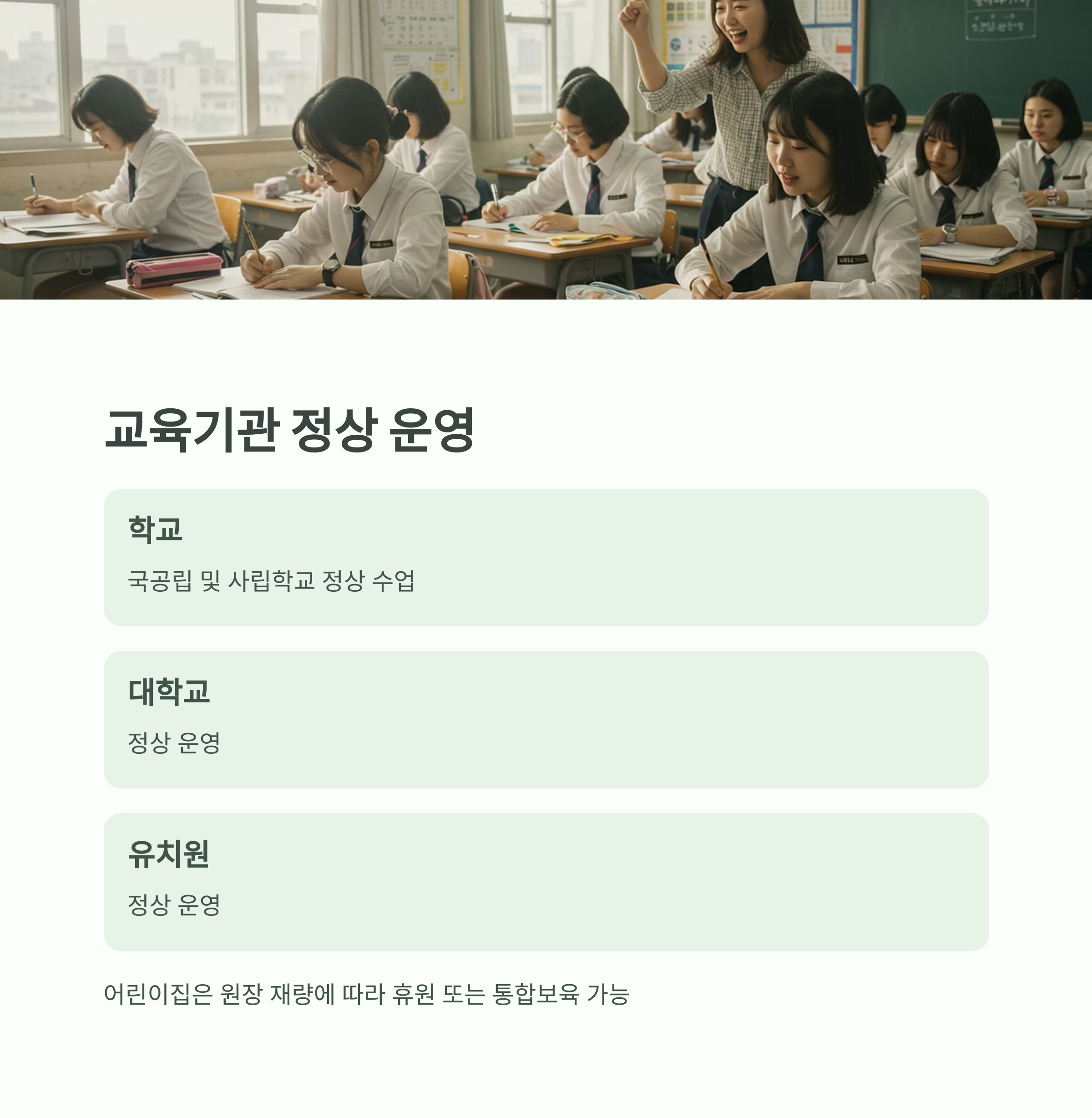 | 학교/대학교 | 정상 운영 | 교사, 교수는 출근 |