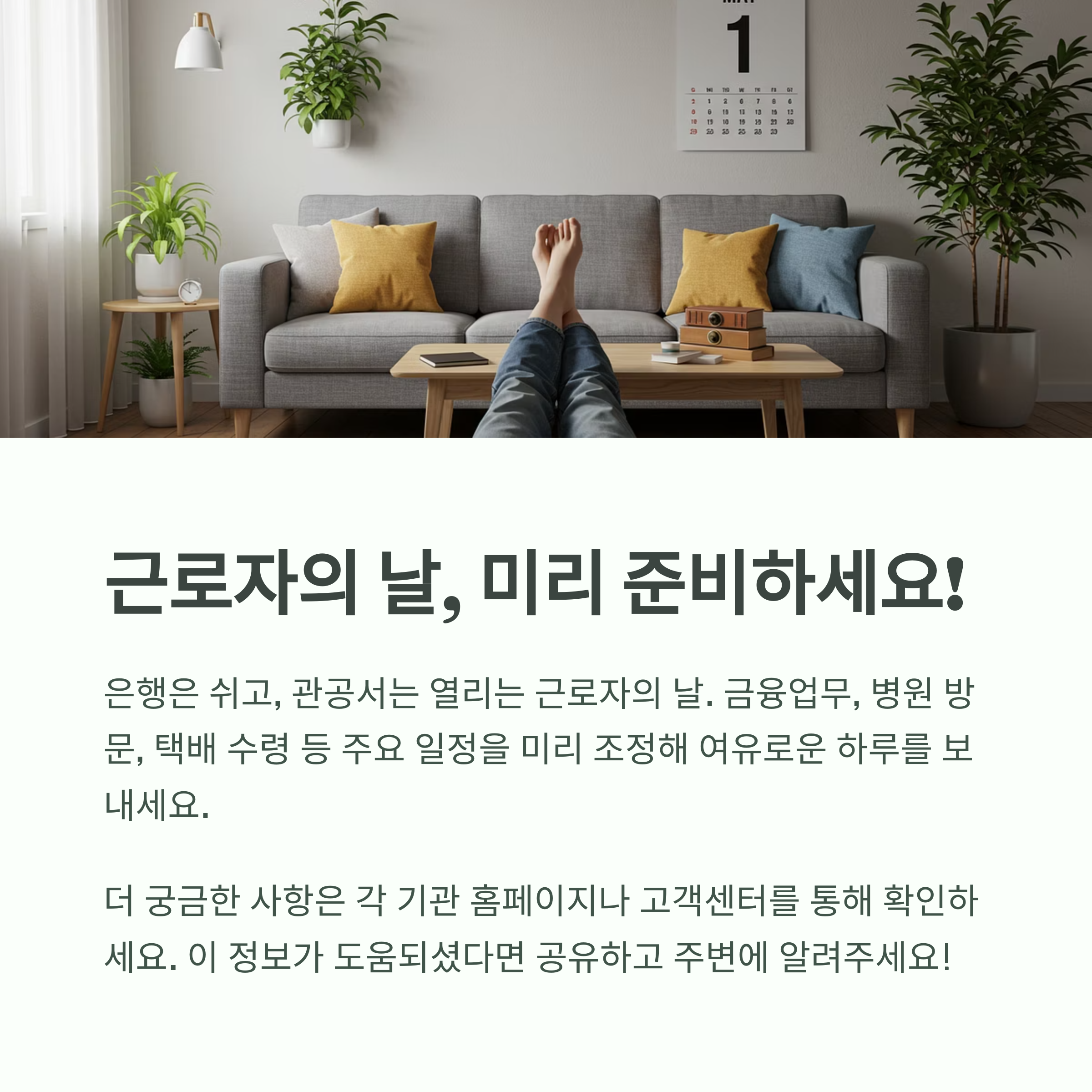 근로자의 날은 기관별로 운영 여부가 달라 방문 전 꼭 확인하는 것이 필요합니다. 특히 '근로자의날 은행쉬나요'라는 질문이 많은데, 은행은 휴무이므로 금융업무, 병원 방문, 택배 수령 등 주요 일정을 미리 조정해 여유로운 하루를 보내시길 바랍니다.