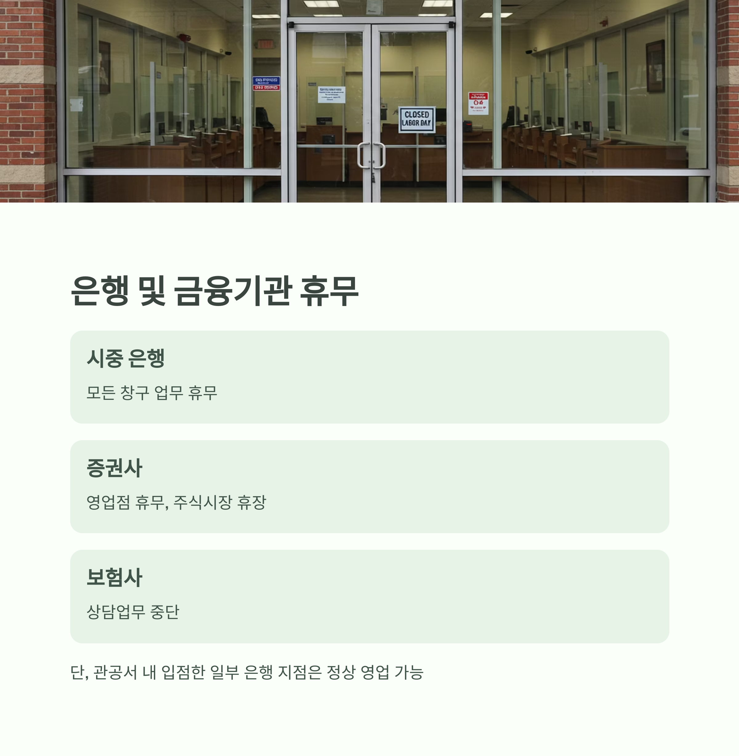 시중 은행, 증권사, 보험사 등 대부분의 민간 금융기관은 근로자의 날 휴무입니다. '근로자의날 은행쉬나요'라는 질문에 대한 답은 '네, 쉽니다'입니다. 은행 창구, 증권사 영업점, 보험사 상담업무 모두 중단되니 사전에 금융업무를 마쳐야 합니다.
