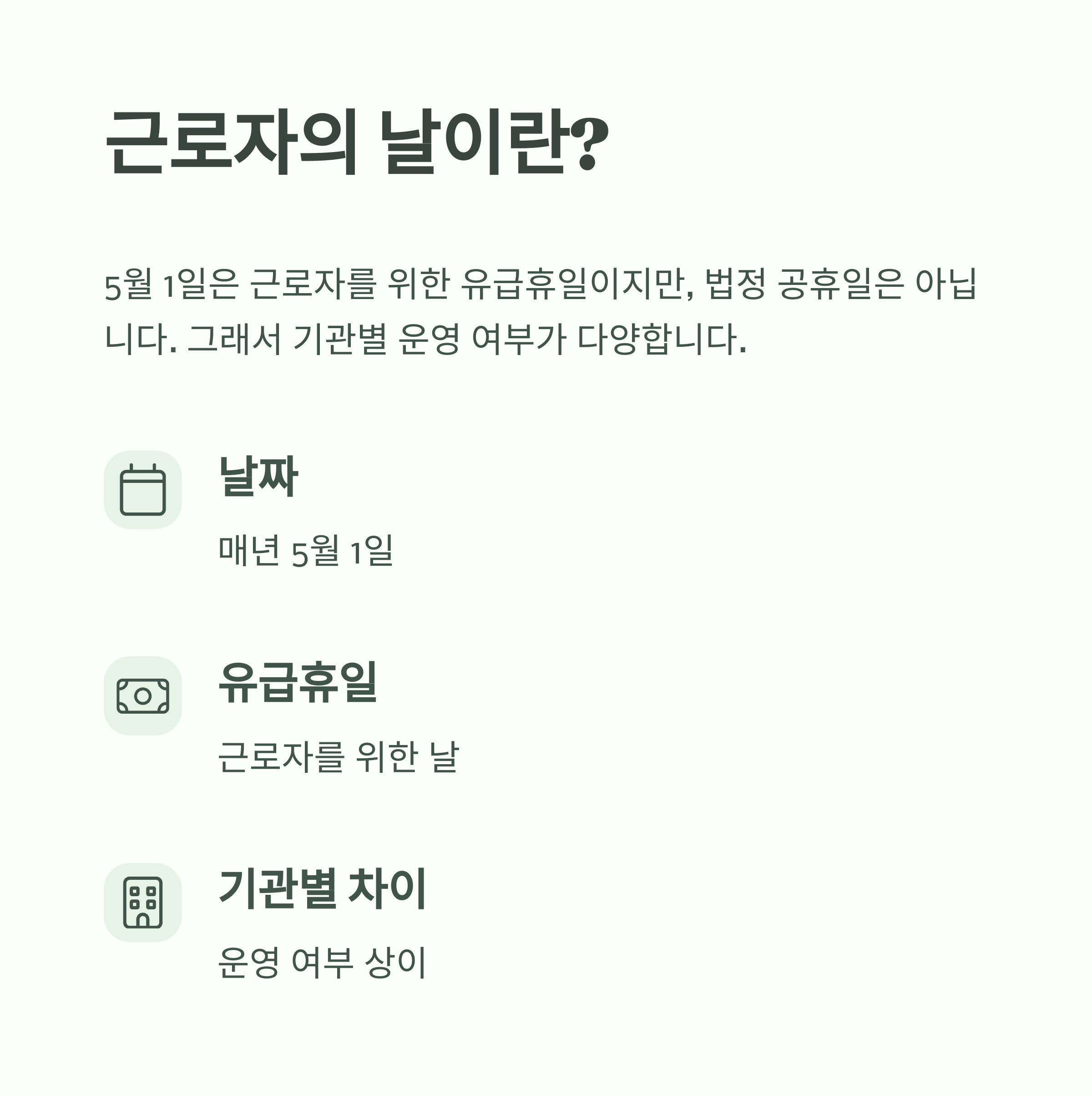 근로자의 날(5월 1일)은 근로자(직장인)를 위한 유급휴일이지만, 법정 공휴일은 아니기 때문에 기관별 운영 여부가 다릅니다. 많은 분들이 '근로자의날 은행쉬나요'라는 질문을 자주 하시는데, 이번 글에서는 주요 기관과 시설의 근로자의 날 운영 현황을 깔끔하게 정리해드리겠습니다.