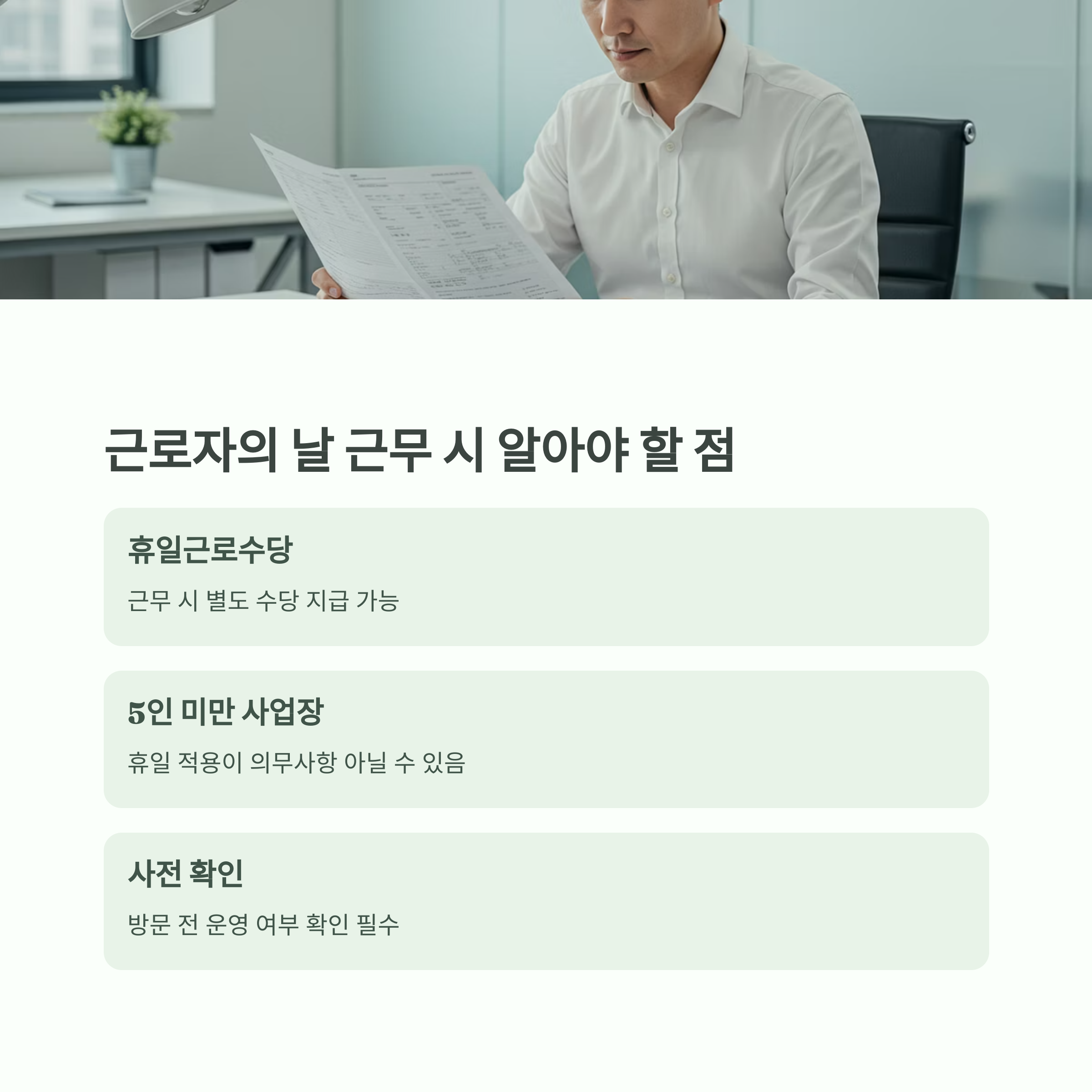 근로자의 날에도 근무하는 근로자는 휴일근로수당을 별도로 받을 수 있습니다. 단, 5인 미만 사업장 소속 근로자는 근로자의 날 휴일 적용이 의무사항이 아닐 수 있으니 주의하세요.
