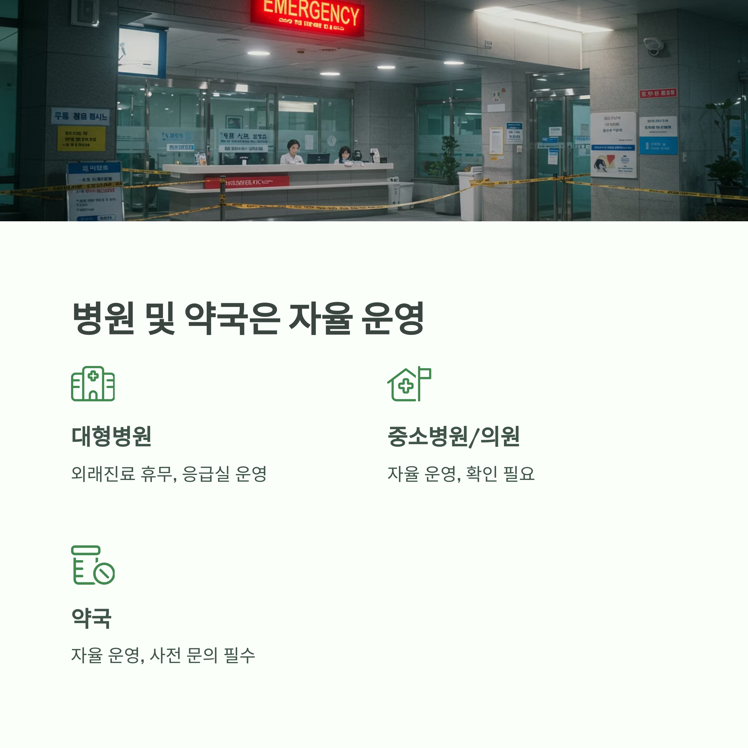 | 병원/약국 | 자율 운영 | 응급실 24시간 운영, 사전 문의 권장 |