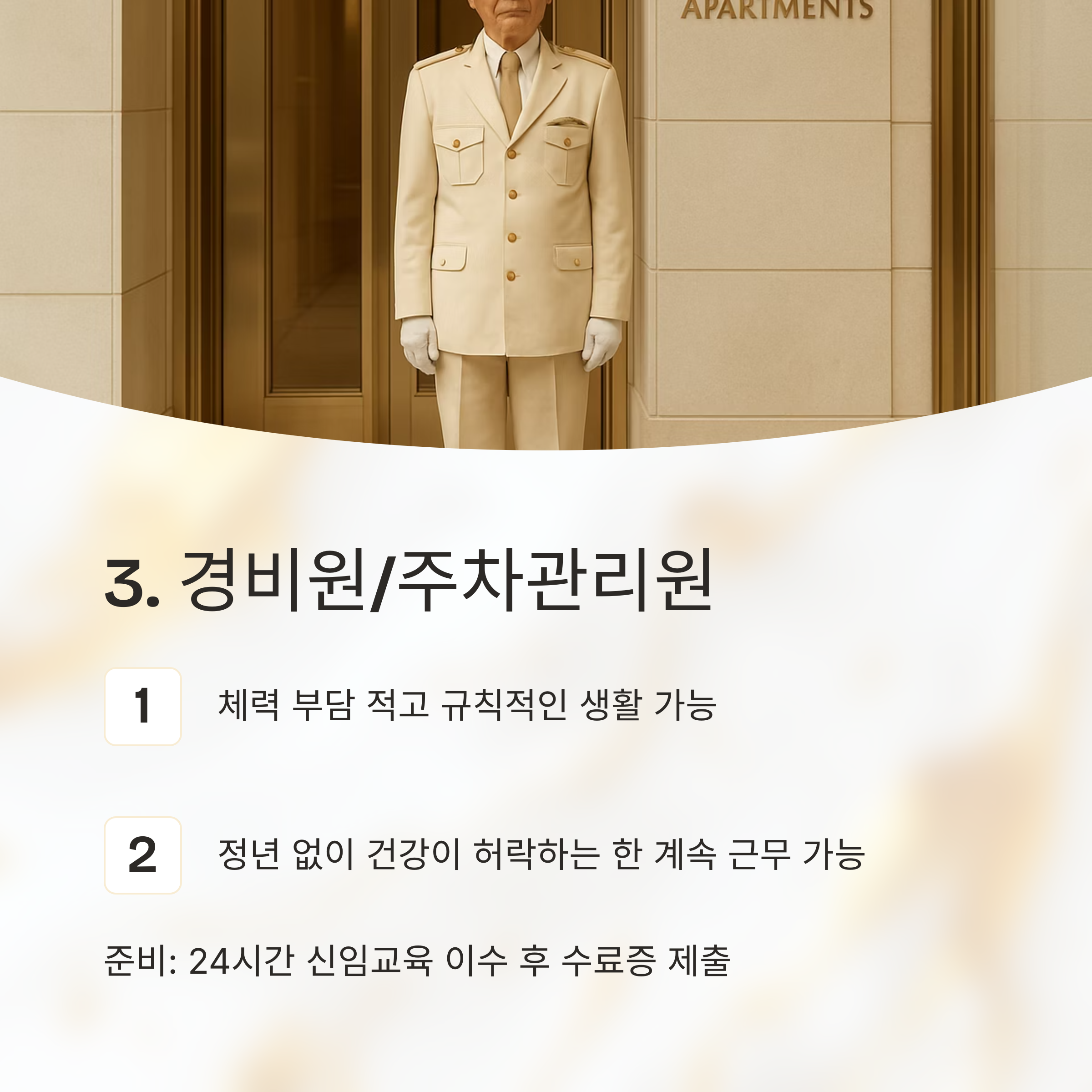3. 경비원/주차관리원: 안정된 근무 환경, 정년 無