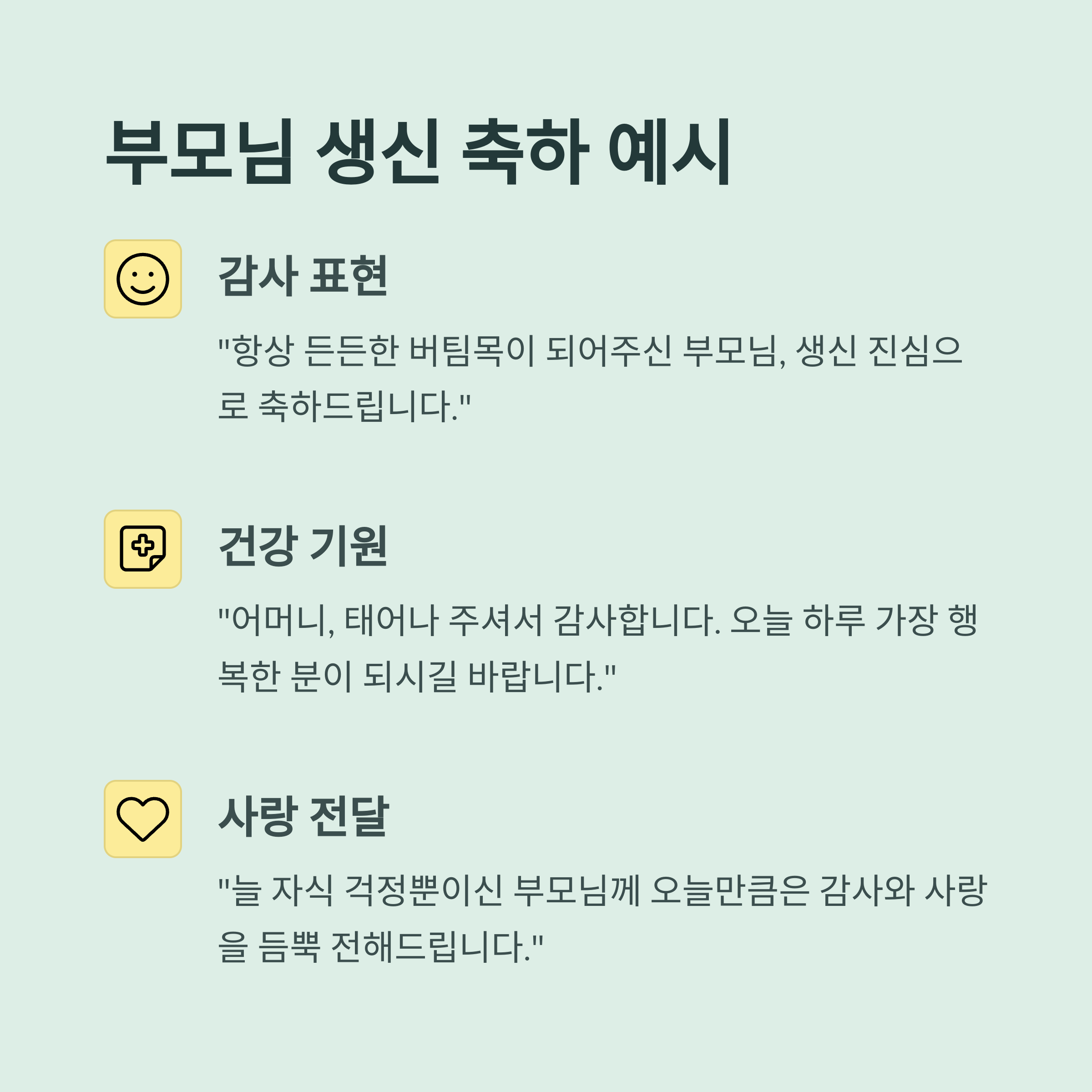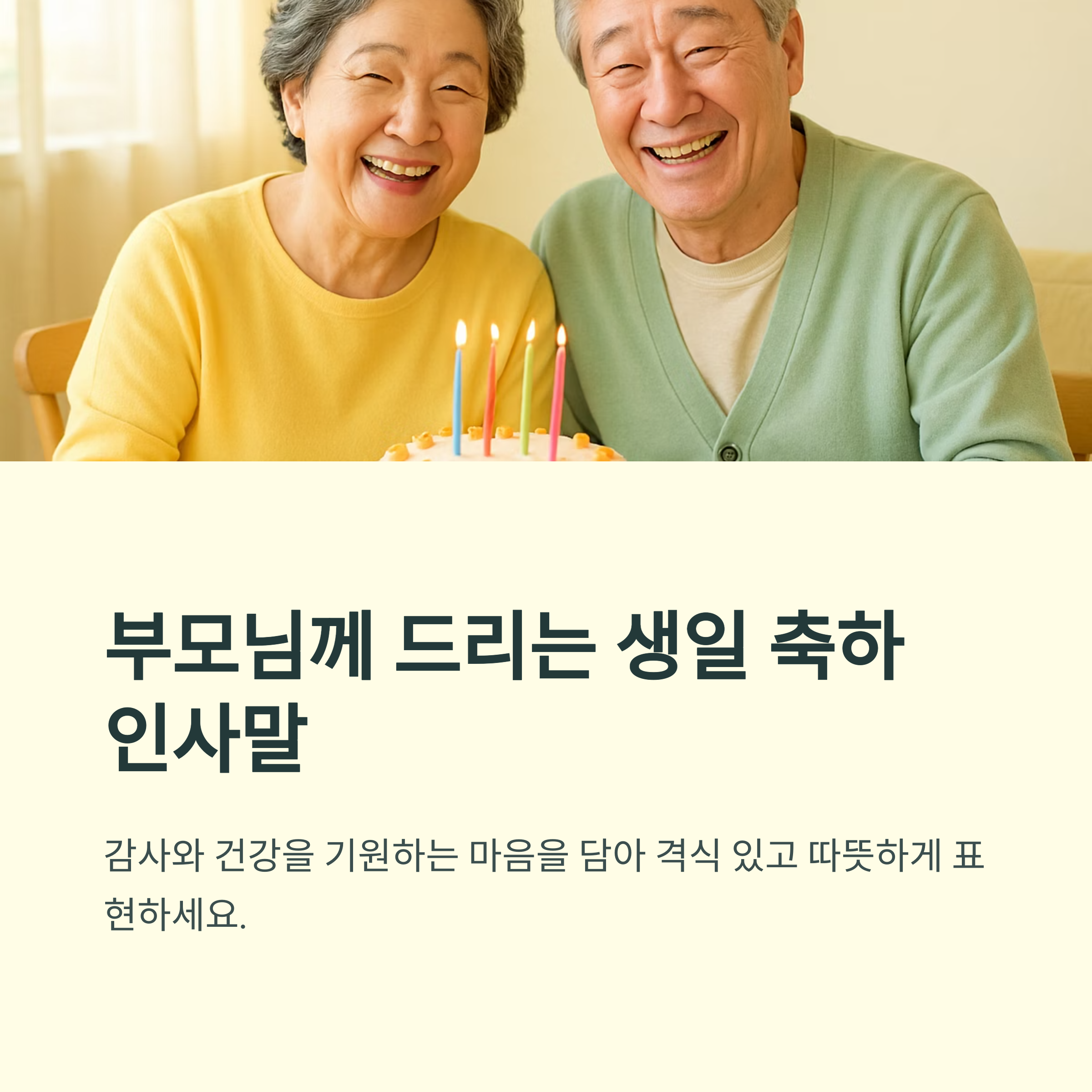 - "늘 자식 걱정뿐이신 부모님께 오늘만큼은 감사와 사랑을 듬뿍 전해드리고 싶습니다. 생신 축하드립니다!"