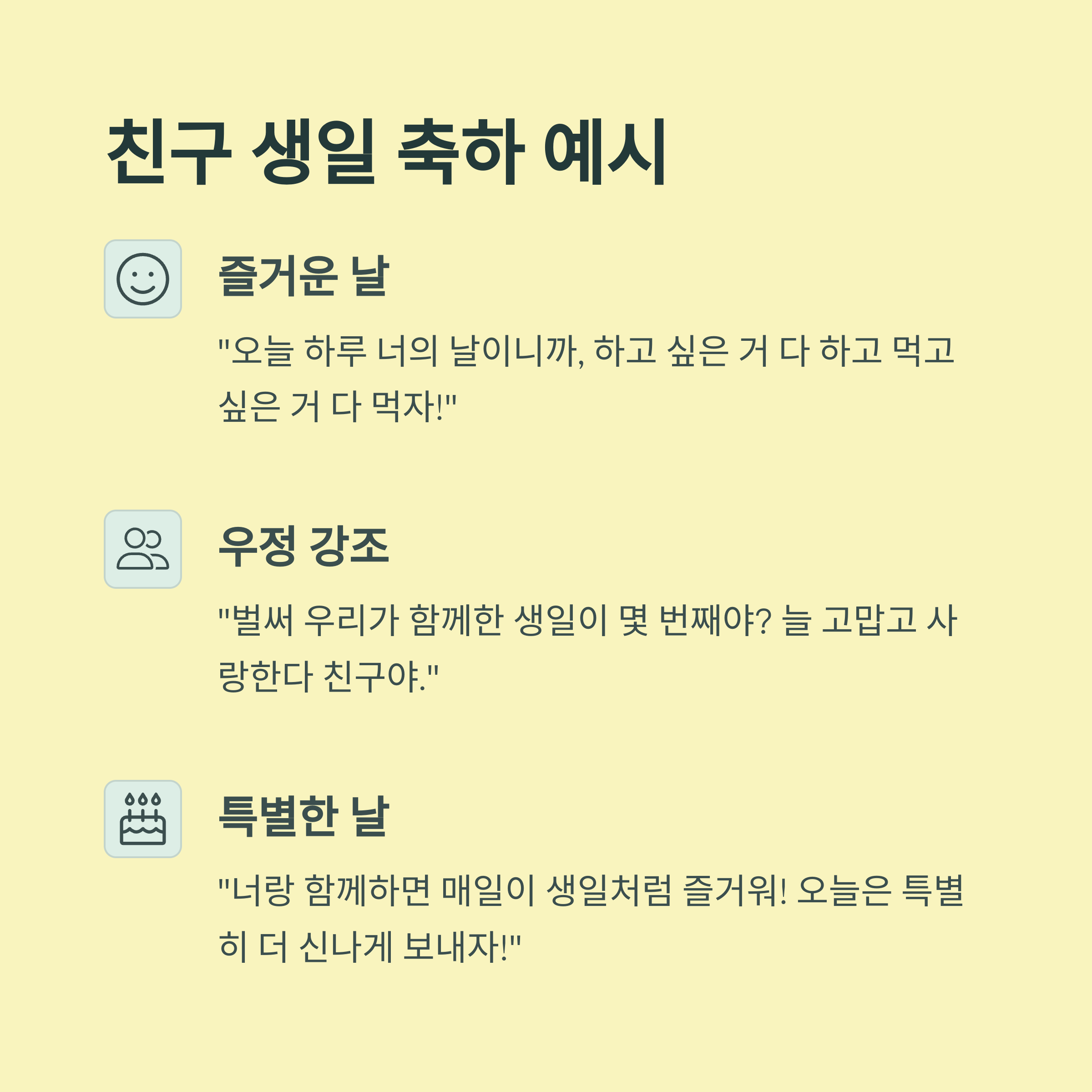 - "너랑 함께하면 매일이 생일처럼 즐거워! 오늘은 특별히 더 신나게 보내자!"