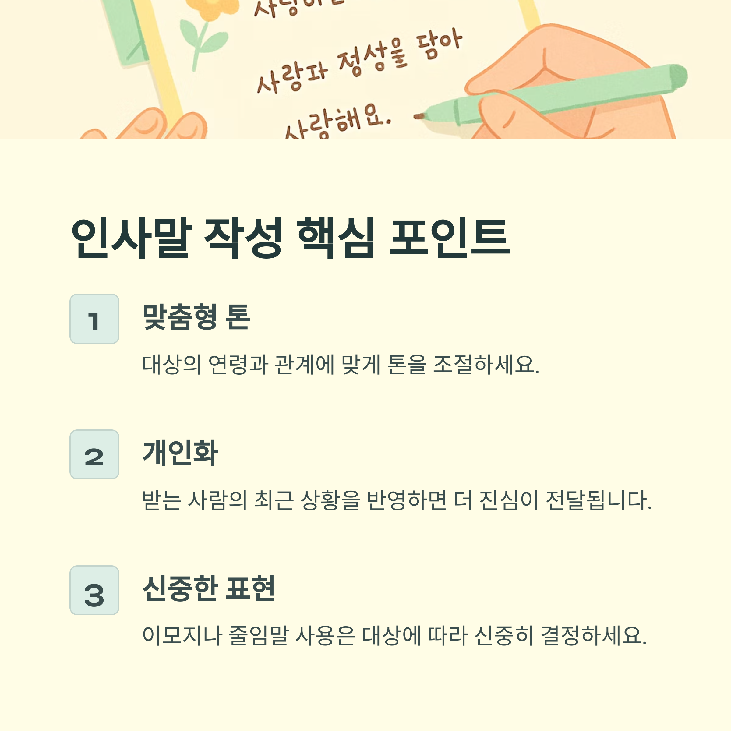 받는 사람의 연령과 관계에 맞게 적절한 톤을 선택하고, 개인적인 상황을 반영하면 더욱 진심이 전달됩니다.