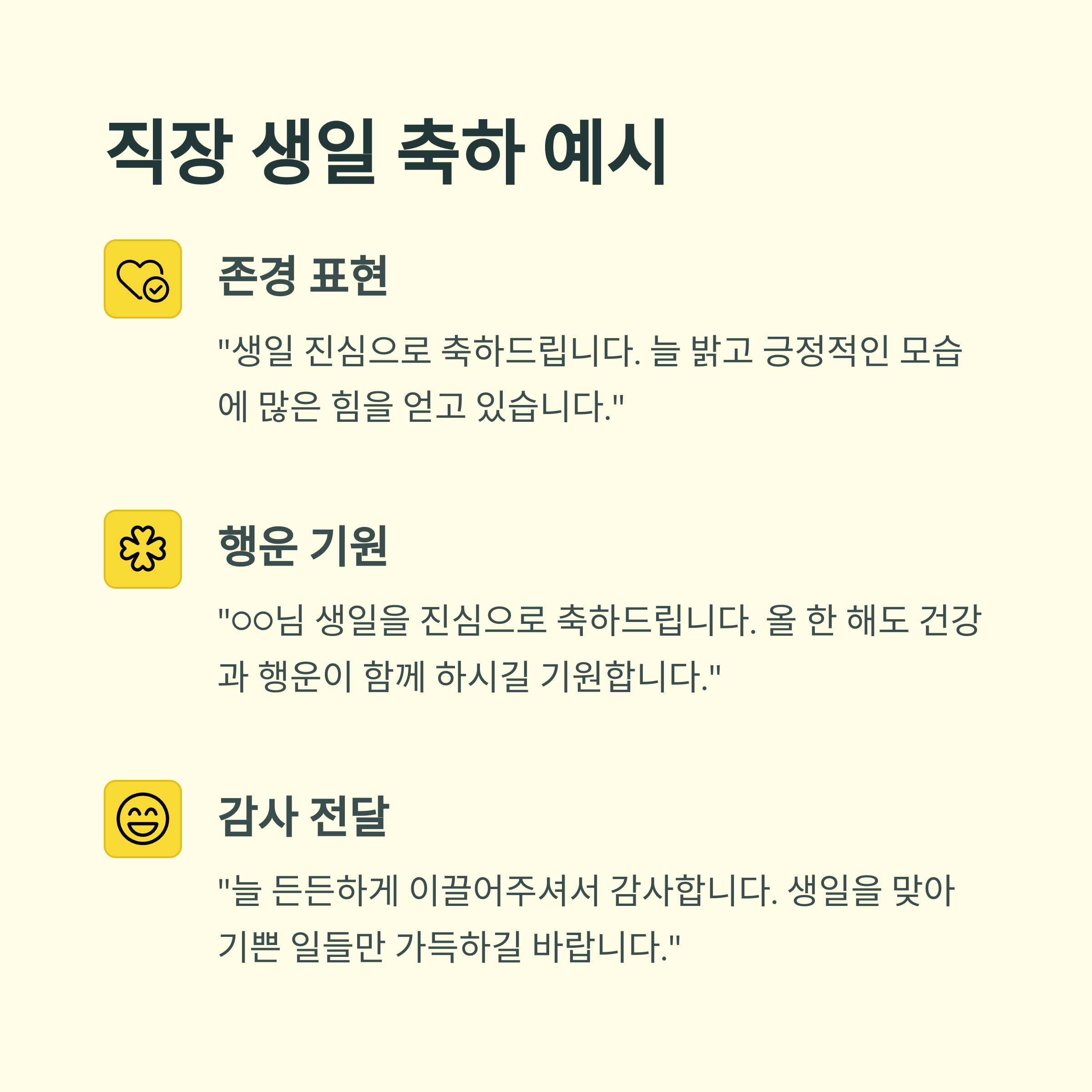 - "○○님 생일을 진심으로 축하드립니다. 올 한 해도 건강과 행운이 함께 하시길 기원합니다."